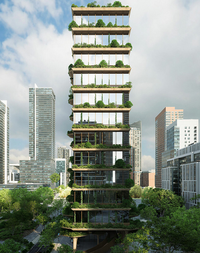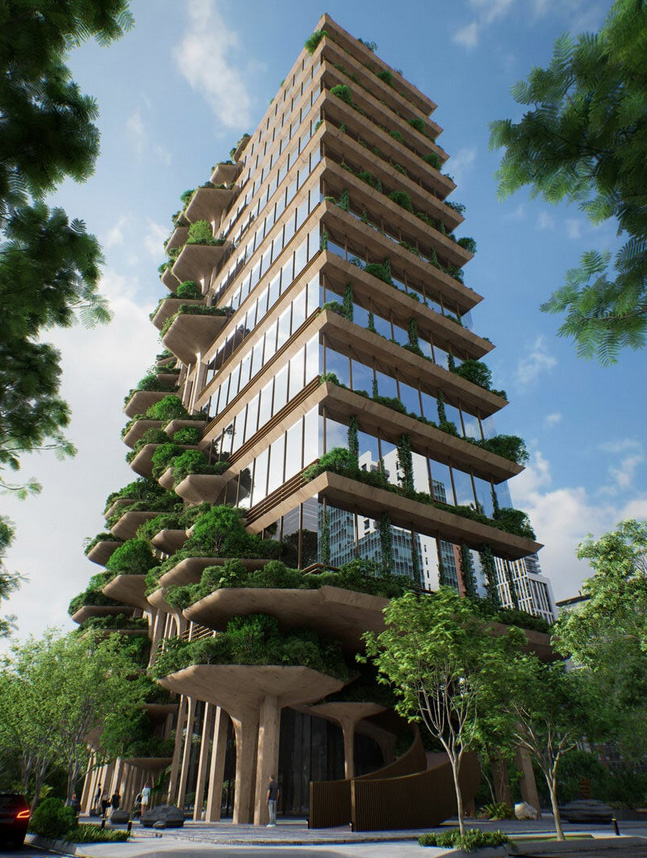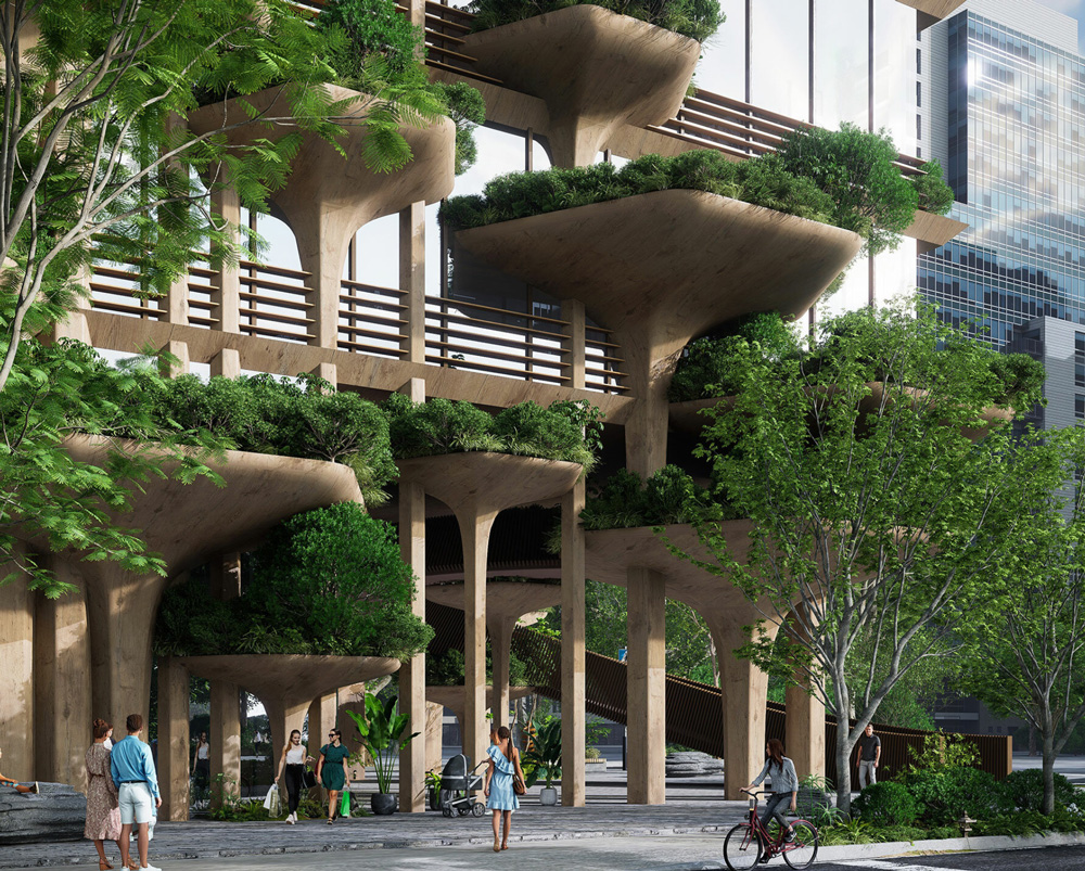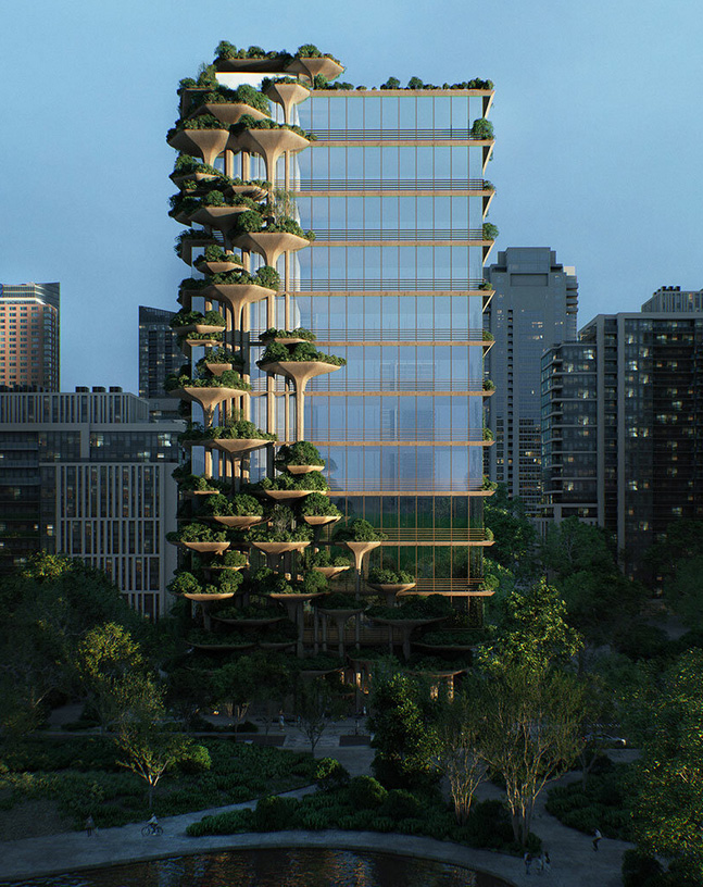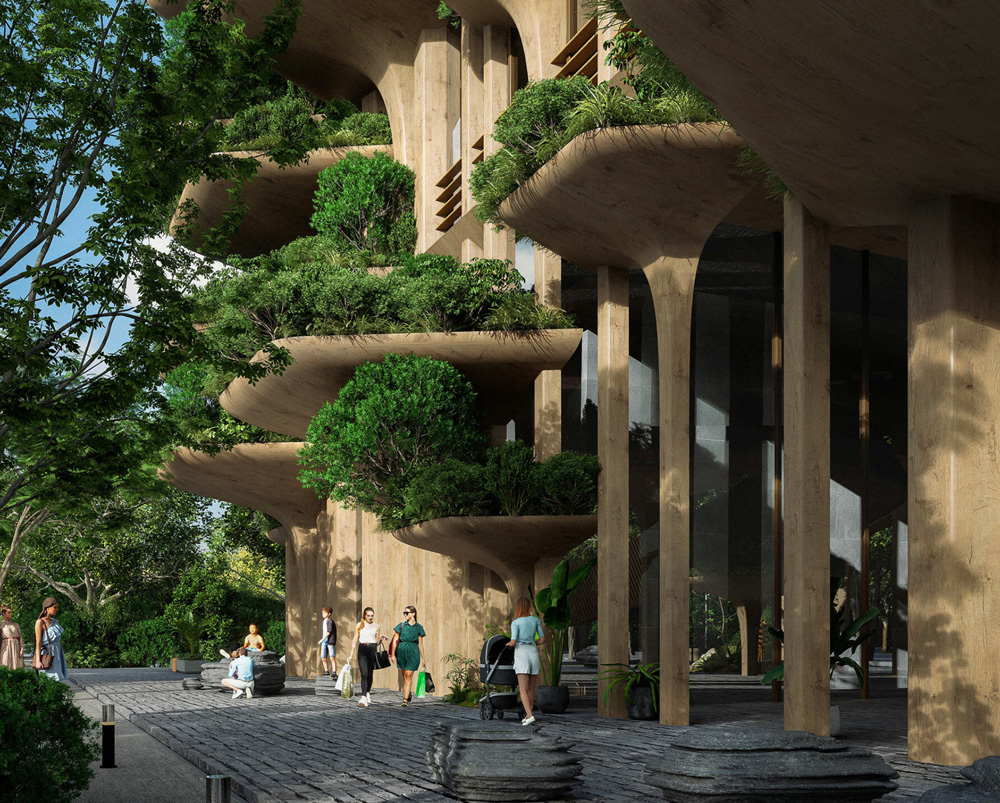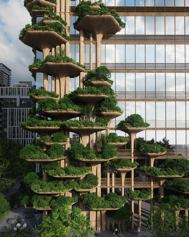 This strategy is driven by the concept of biophilic design — an approach that learns from natural processes and applies them in the creation of more efficient man-made environments connected to nature. The architects weave this principle into the fabric of the tower, creating a symbiotic relationship between the built space and the living ecosystem. The scattered planters, echoing fungal growths colonizing a tree trunk, are more than just ornament. Instead, they become pockets of life that purify the air, provide refuge for biodiversity, and offer occupants a direct link to nature amidst the busy urban context.