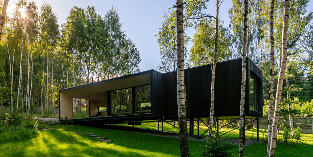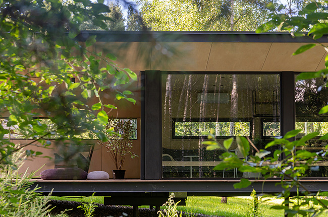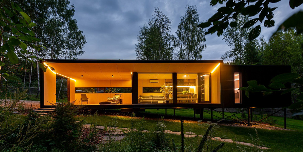 Designboom_ Coexisting with nature, HDN Modular is a pilot project of the NOW-House modular system that rethinks paradigms of contemporary living. Realized by LEVEL 80 Architects, the project advocates for simpler yet elevated living in compact spaces, utilizing prefabricated construction systems and encouraging local production. The cabin, unintrusive to nature, perches atop metal stilts to preserves its natural terrain and minimizes need for extensive earthworks, while providing panoramic views that blur boundaries between indoor and outdoor realms. The architect has further integrated energy-efficient features and crafted a conscious material palette of primarily wood to achieve a synergy between human habitation and the environment. ‘Suitable for year-round living it is a sustainable competitor to a cast-in-place house,’ notes the team.