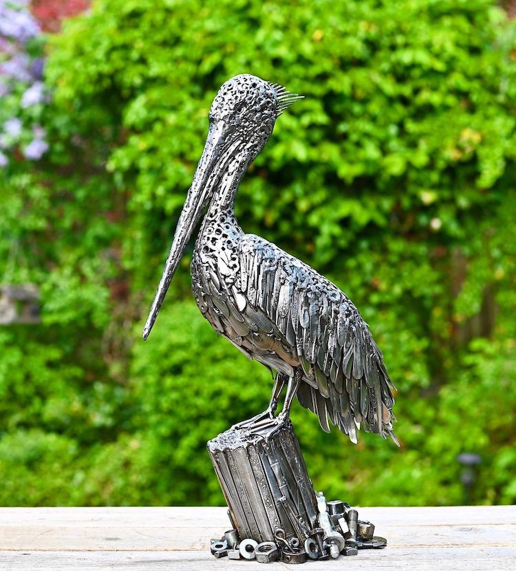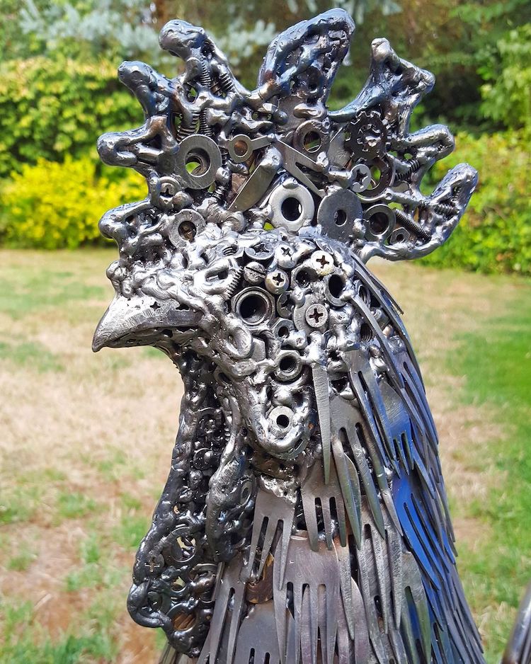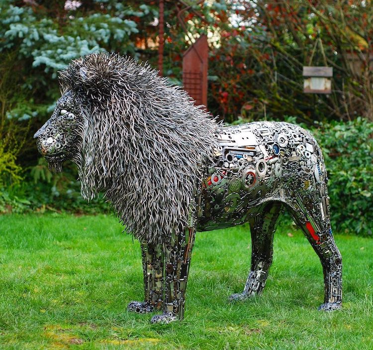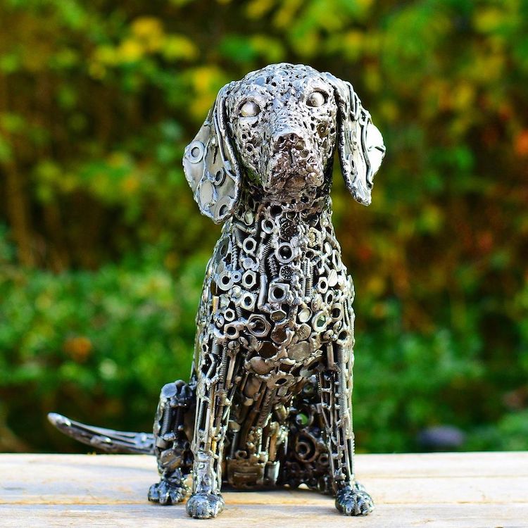 Mymodernmet_ Discarded materials find new life in the art of Brian Mock. The Oregon-based creative collects scrap metal parts like screws, nuts, and bolts and fuses them together to create striking metal sculptures of different animals. Bears, dogs, cats, and many more are reimagined as futuristic life-size statues.