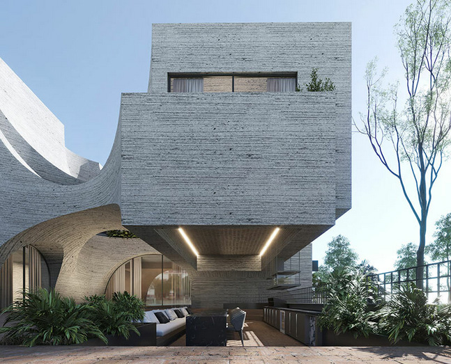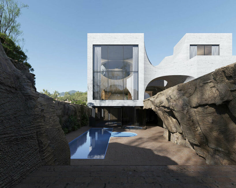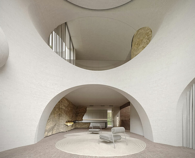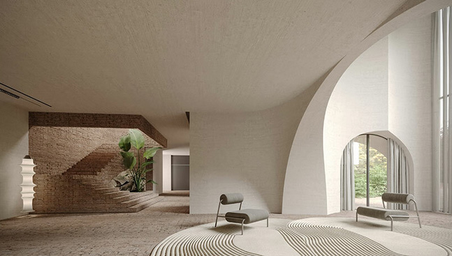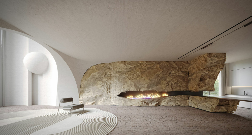 The design process driving Team Group’s Saya Villa involves a dialogue of contrasting elements. The architects note that from its exterior, the structure aims to suggest a sense of calm and order, with a strong yet calming presence firmly rooted in stone. In contrast, interiors are sculpted with dynamic and fluid spaces. This duality is achieved through careful manipulation of space, employing concepts of filling and emptying, and embracing soft curves that create an inviting interior.