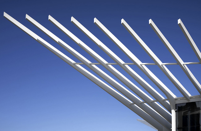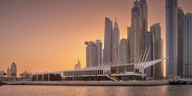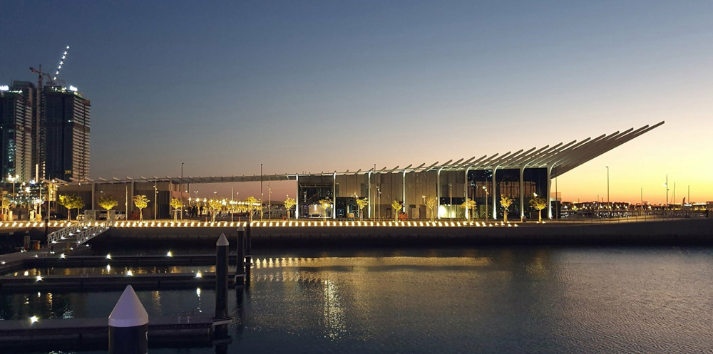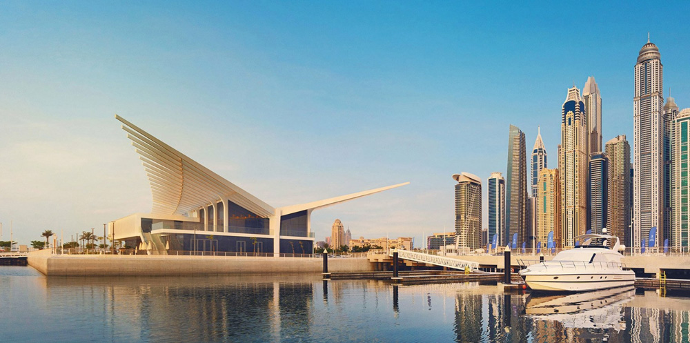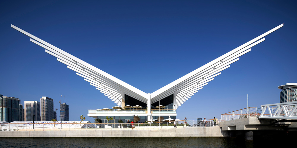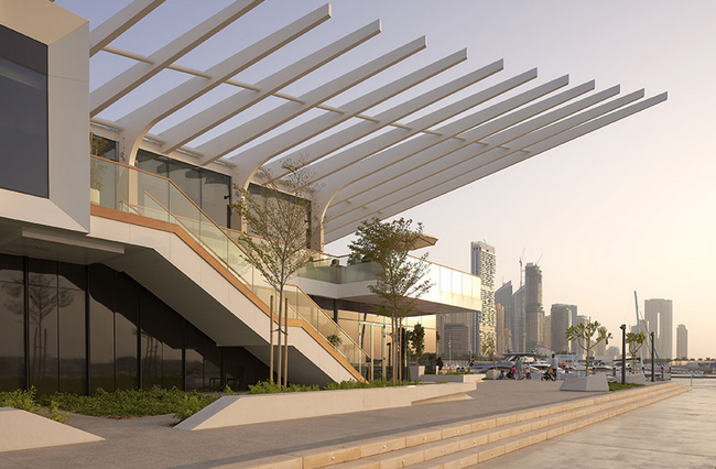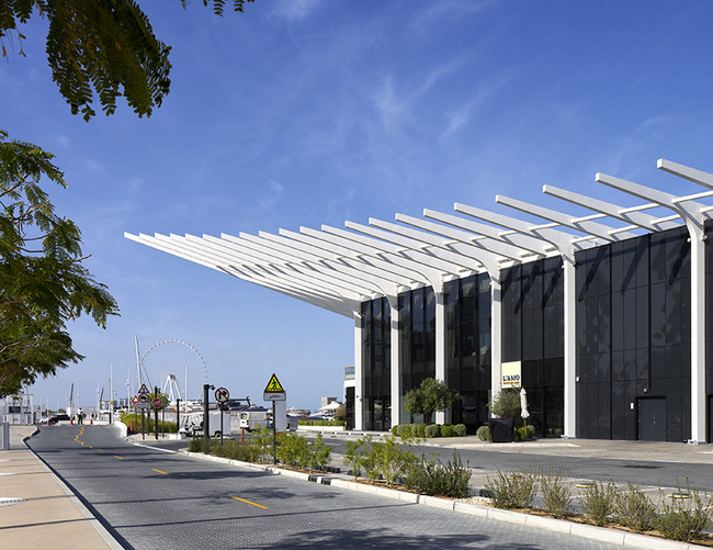A curving steel finned roof extends over AMA`s dubai harbour yacht club