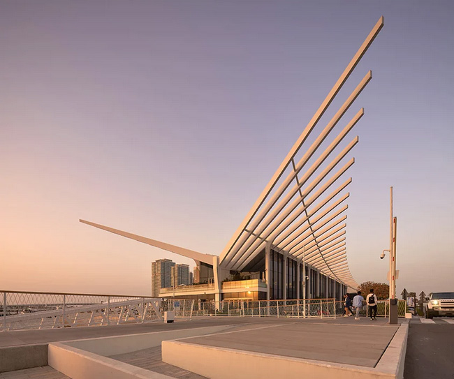 Designboom_ The Dubai Harbour Yacht Club stands as a beacon along the waterfront with its expressive steel finned roof that extends towards the marina, creating a welcoming sight for approaching boats. The structure, realized by Andy Shaw and Naji Mahmoud of AMA studio, is located on the western side of Dubai in between the Palm Jumeirah and Dubai Marina, a key anchor of the Dubai Harbour development scheme. Offering amenities and panoramic views across the water to the city skyline, the building is made with both a concrete and steel based structure, with the feature roof fabricated from steel box beams, each distinctly shaped, sized, and angled to contribute to the overall expressive curve.