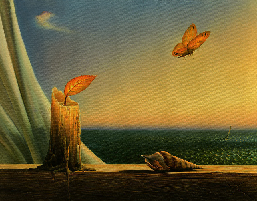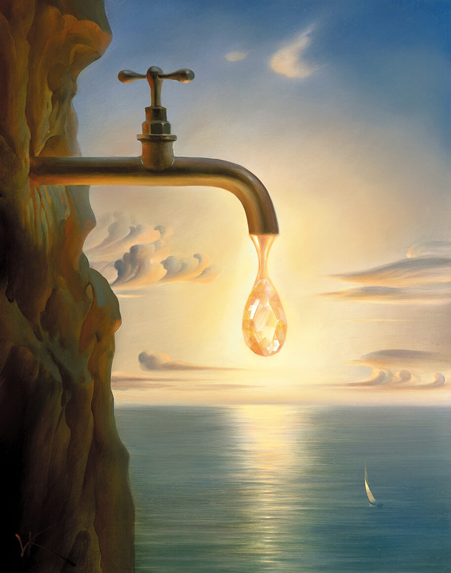 In “Forgotten Sunglasses,” Vladimir Kush takes a seemingly mundane object and transforms it into a focal point for introspection and wonder. The painting features a pair of sunglasses left behind on a sandy beach, but with a twist: the lenses serve as windows to another world, revealing a vibrant underwater seascape teeming with marine life. The juxtaposition of the forgotten sunglasses and the vivid world within them prompts viewers to consider themes of perception and reality.