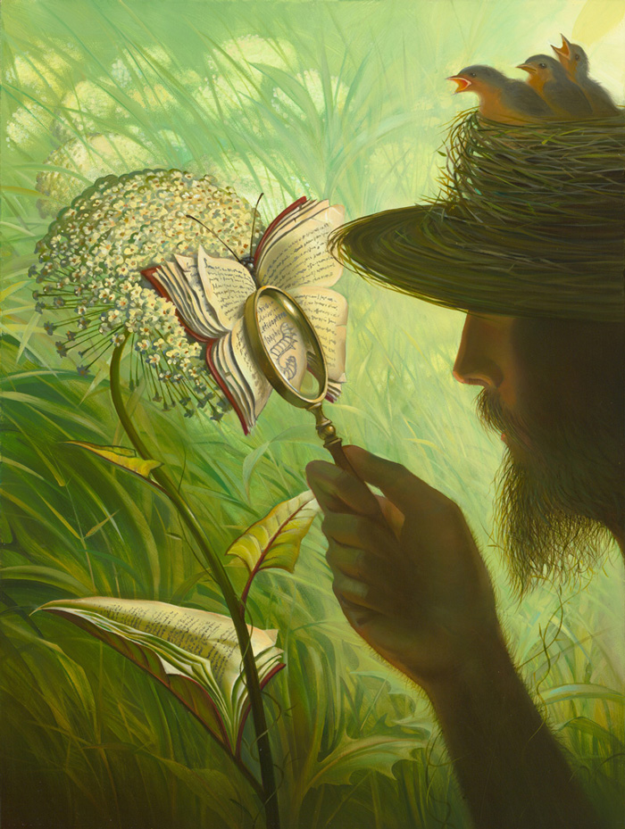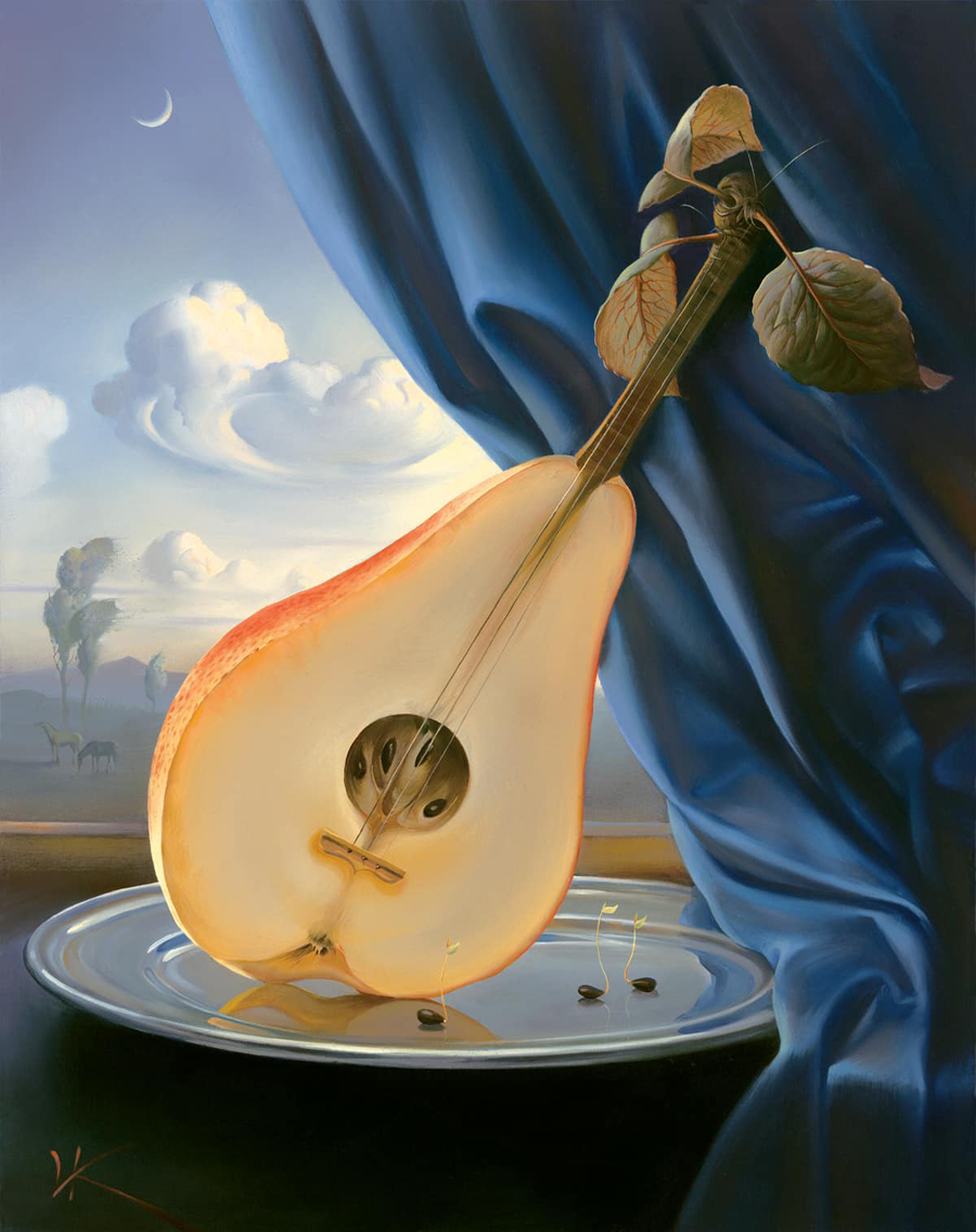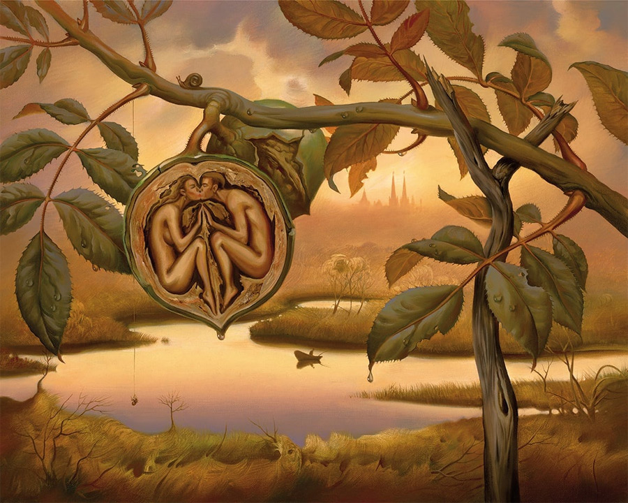 Another remarkable piece, “Walnut of Eden,” depicts a walnut shell containing a miniature paradise, complete with a tiny Adam and Eve. This painting plays with the concept of scale and the idea that entire worlds can exist within small, seemingly insignificant objects. It challenges viewers to reconsider their understanding of space and importance, suggesting that beauty and complexity can be found in the most unexpected places.