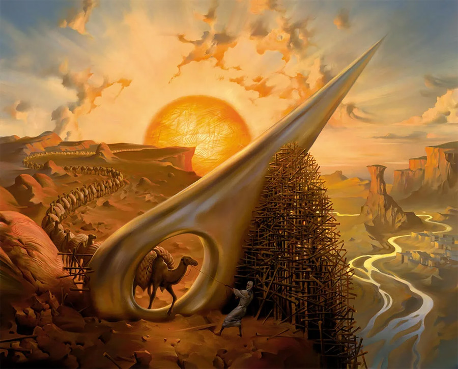 For example, in “Eye of the Needle,” Vladimir Kush presents a mesmerizing fusion of the organic and the man-made. The painting features a giant needle, its eye forming a gateway to a new dimension or perhaps another world altogether. Instead of thread, a ship sails through the eye, as if embarking on a journey through time and space. The sky and sea blend seamlessly in the background, adding to the painting’s ethereal quality.