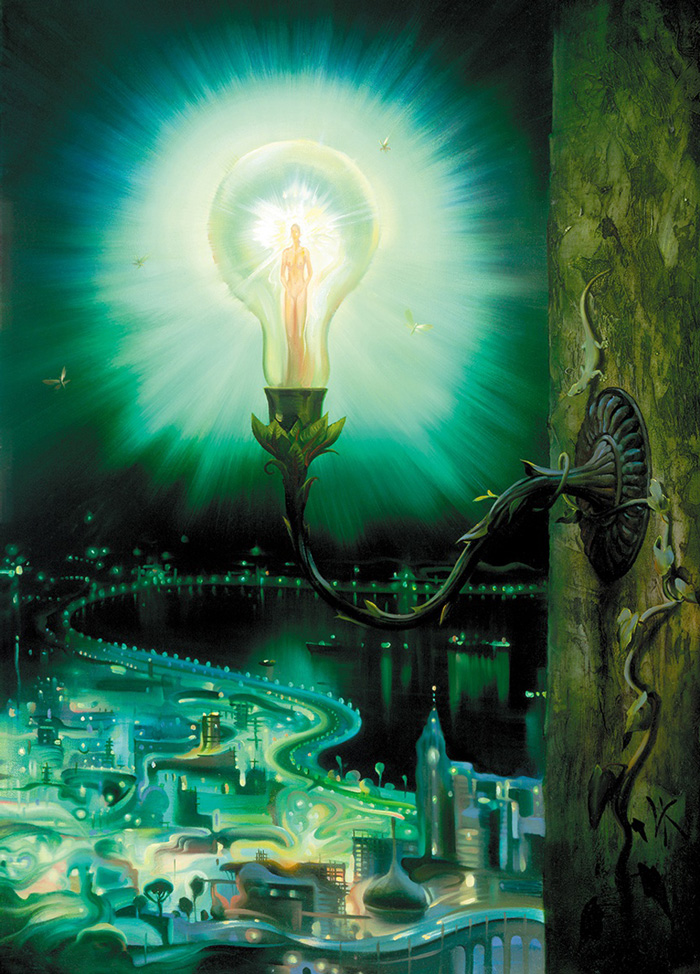 One of his most famous paintings, “Departure of the Winged Ship,” showcases a ship with sails made of giant leaves, floating above a sea of clouds. This painting exemplifies Kush’s ability to merge the natural world with human invention, creating a harmonious yet surreal landscape. The painting serves as a metaphor for human aspiration and the limitless possibilities of imagination.