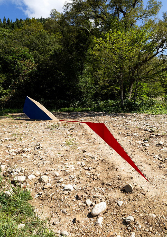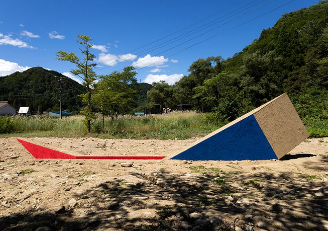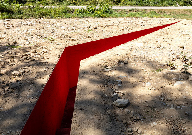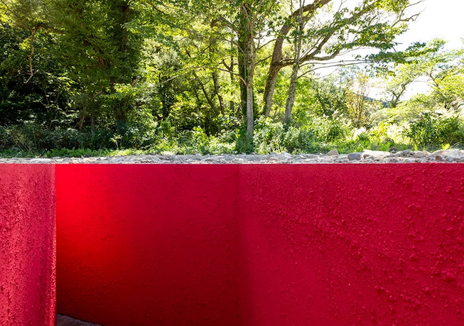 Designboom_ Amid the tranquil landscape of Toga, Japan, Serpent Lady is a land art project bridging nature and human existence. Realized by HAJIME YOSHIDA ARCHITECTURE, the project sits at the confluence of a mountain and river, slicing the earth with a deep, slender hole. Its vibrant red hue starkly contrasts the earthen tones and tapestry of insects and animals that encircle it, while its bold geometric form infuses a sense of order to the site, where there were previously no physical elements. Concealed within are steps which gently invite observers to delve into the embrace of Mother Earth. ‘This is a landscape space that reconstructs new relationships with the earth and its life,’ note the architects.