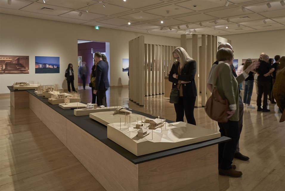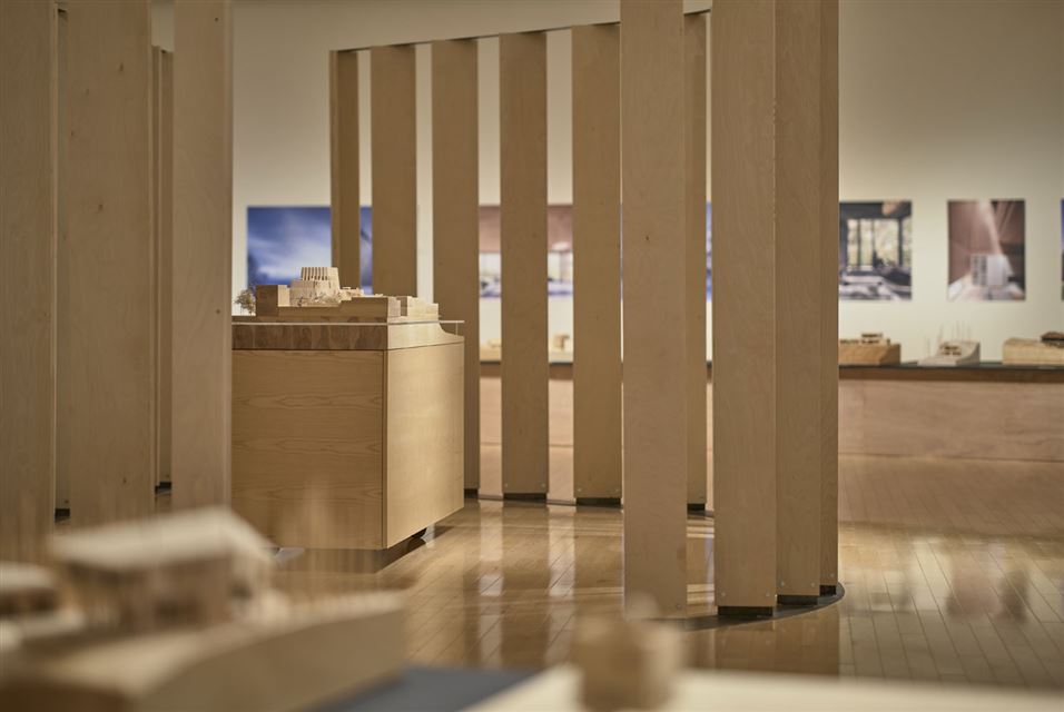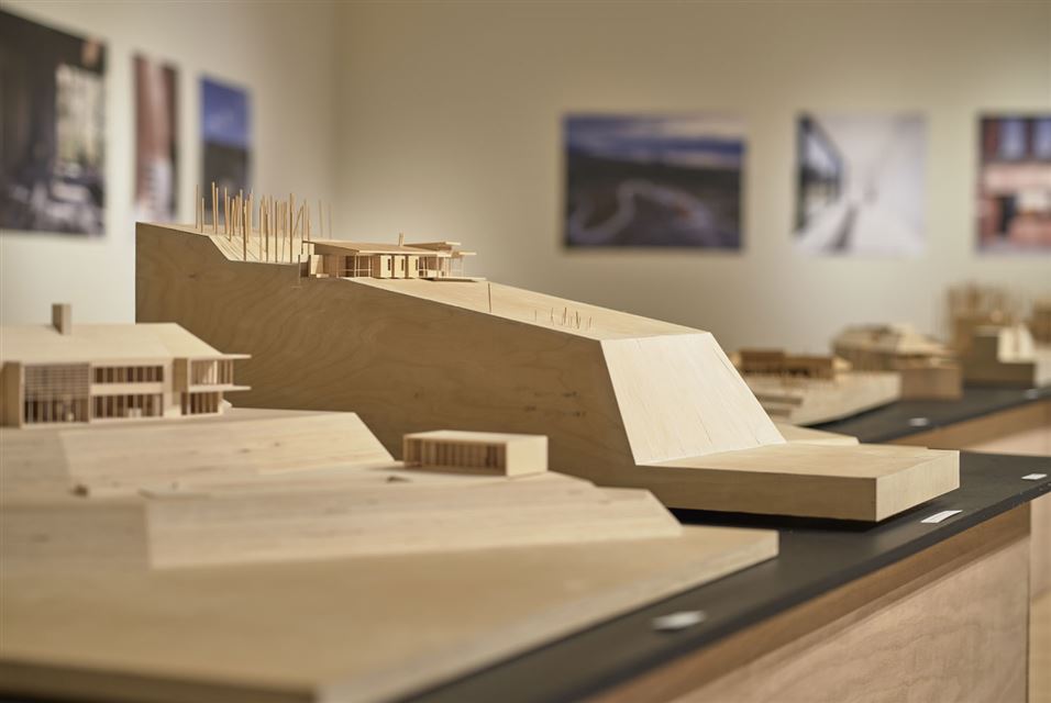 The exhibition features 32 large-scale photographs, 23 hand-crafted architectural models, and one custom-designed architectural enclosure created by Omar Gandhi Architects.