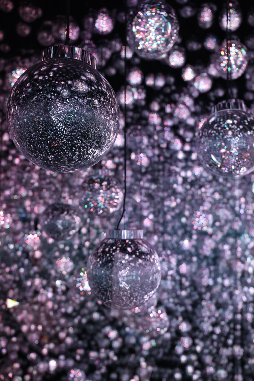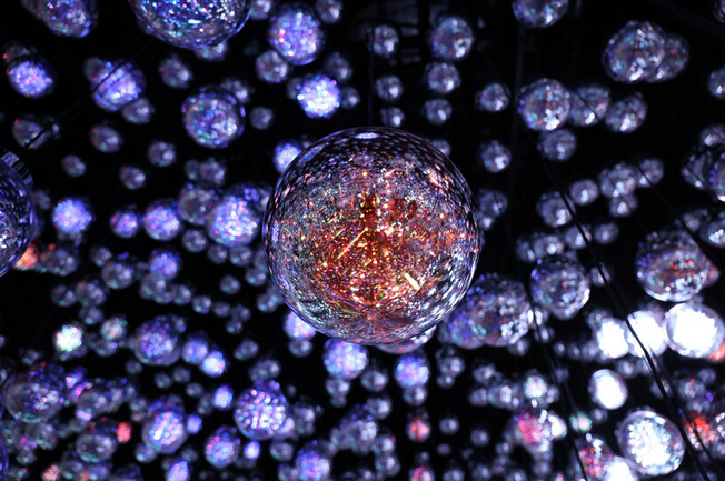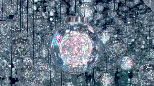 The first exhibition, Bubble Universe, is part of teamLab’s recent art project and is an interactive installation filled entirely with spheres that generate an endless interplay of light. Within these spheres, a blend of different lights, resembling soap bubbles, jelly-like masses, and stationary lights, creates an interconnected environment where neighboring spheres contribute to the ambient light. When someone pauses near a sphere, the closest one shines brightly and emits a tone, transmitting light to its nearest neighbors, creating a singular path of light. This interactive artwork, seemingly random in its arrangement, features resonating lights influenced by people’s interactions. As visitors interact within this space, the lights respond dynamically, creating a mesmerizing interplay influenced by their relationships and movements.