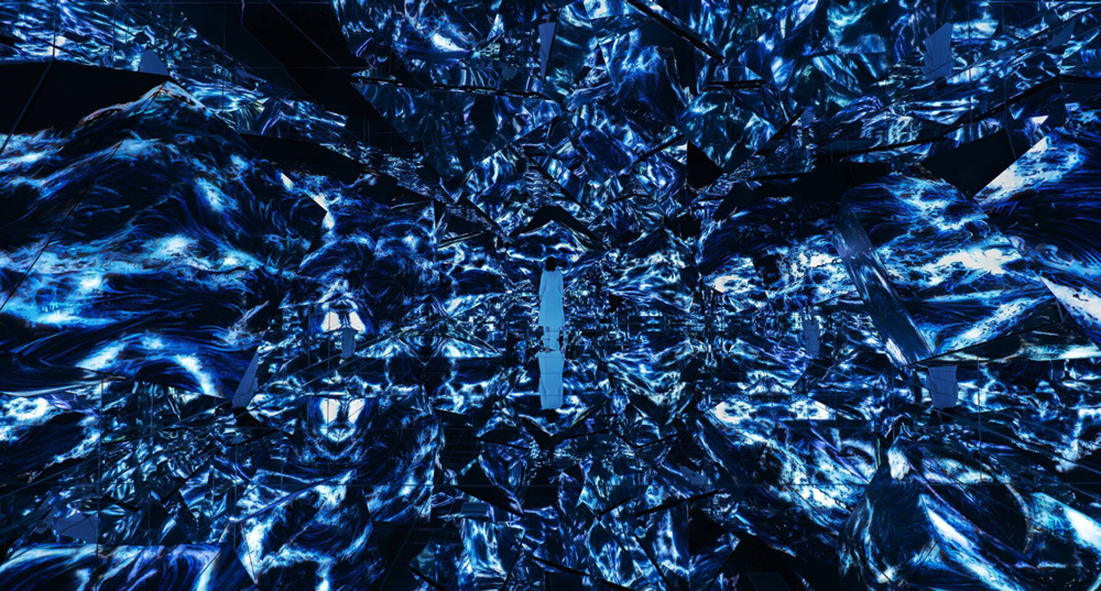 The other exhibition at the teamLab Borderless, currently in progress, is titled Megalith Crystal Formation and is divided into two parts: Flowers and People; and Black Wave. The first depicts masses of various time and space elements connecting harmoniously. Flowers within the installation undergo a natural cycle —blooming, withering, and fading away. When people move, the flowers disperse, but when they stand still, the flowers flourish. Created by a computer program in real-time, this interactive artwork changes continuously with viewer interaction, ensuring each visual state is transient and cannot be experienced again. The second part illustrates various temporal and spatial elements that exist randomly, yet connect to each other. This artwork emphasizes the interconnectedness of oceans and waves worldwide, symbolizing the essence of life. Waves represent life’s energy and vitality, appearing alive as they rise and disappear, eventually merging back into the ocean. teamLab creates these waves using simulations of water particles in 3D space, creating lines along their trajectories through what they term Ultrasubjective Space. This space liberates the viewer from fixed perspectives, ensuring a harmonious connection between the viewer’s space and the artwork itself.