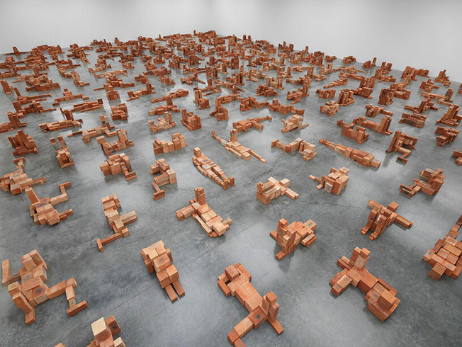 Introducing a grounded counterpart to Retreat, Gormley’s Resting Place (2023) unfolds in the expansive South Gallery II, forming a dense urban landscape. This installation consists of fired clay blocks that manifest 244 body forms, creating a labyrinthine terrain. Visitors are encouraged to navigate this maze of resting bodies, depicting various poses from prone and splayed to fetal, allowing just enough space for passage. The scenes evoke a spectrum of scenarios, from bodies abandoned on the beach to the struggles of those forcibly displaced by conflicts, climate change, or resource scarcity.