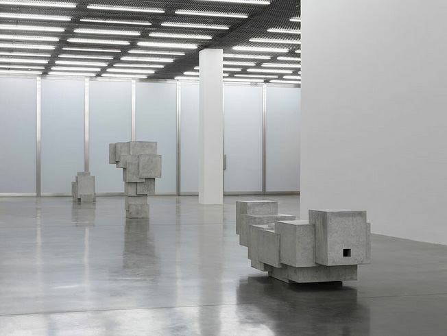 Serving as the backbone of the exhibition, eight concrete sculptures follow a linear path from the courtyard through the corridor at the White Cube Gallery . Crafted by Antony Gormley as ‘intimate bunkers for one,’ each version of Retreat (2022–23) is molded to the artist’s body scale using 55 mm thick reinforced concrete.