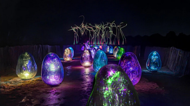 Resonating Microcosms – Solidified Light Color comes through too. Here, Softly dented translucent orbs autonomously, as if they were shunned in outer space and descended from the void as neon comets. These glowing orbs are responsive too. When an ovoid is pushed by a person or is blown by the wind, it radiates bright-colored lights and emits a sound as it repositions itself into its place. Imagine a sea of ovoids that does this, responding to one another while emitting the same light and sound.