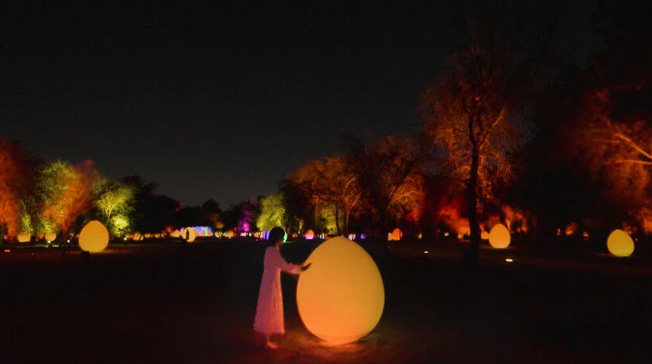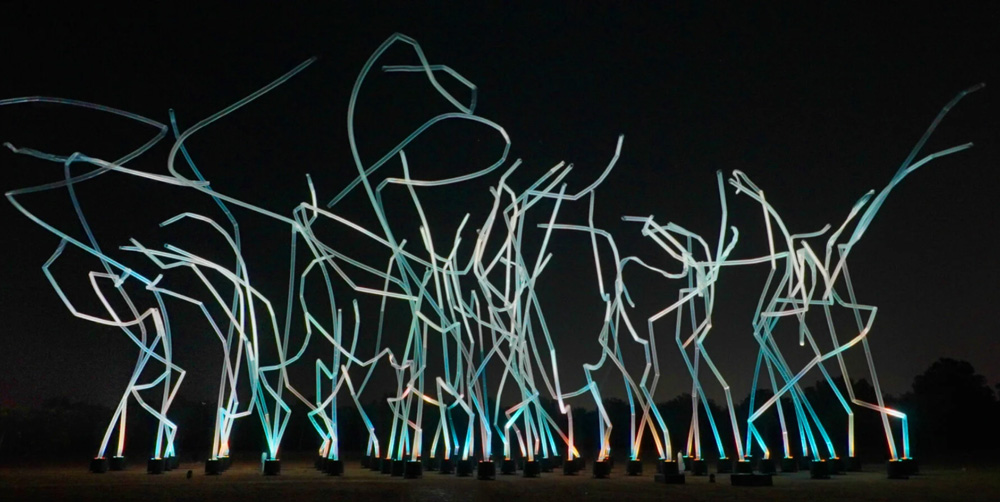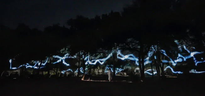 Samaliyah Island becomes the temporary home of teamLab’s Mangrove Island of technicolor light installations, starting with Life is Continuous Light. Visitors pass through the illuminated mangrove forest, and as they walk on, the forest glows even brighter and produces a tone. The light emitted by the series of trees spreads out until the last tree glows in the dark and hums the same soft tone. A continuous and unicursal Spatial Calligraphy is also drawn in the forest where several strips of light intersect and rotate in multiple layers before they eventually disappear.