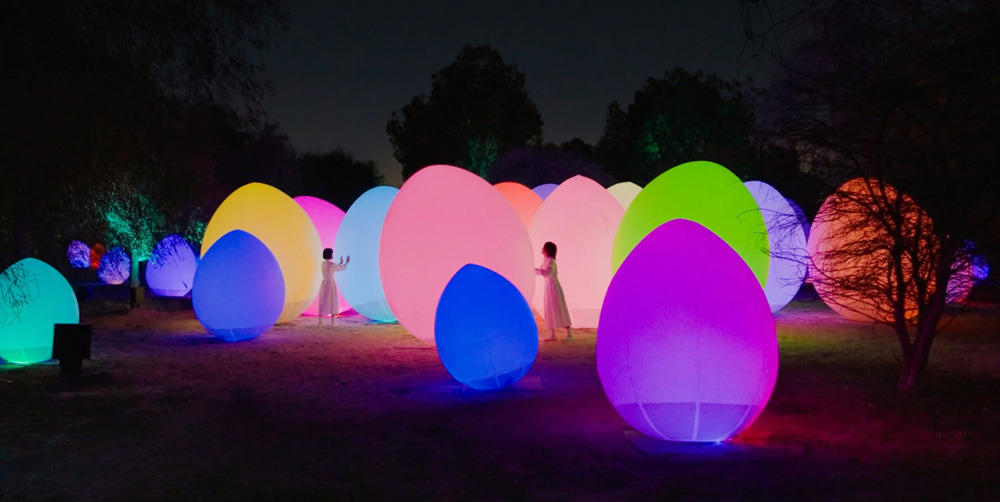 teamLab’s exploration of the humming and moving ovoids continues in Mangrove Island as the team ushers in Forest of Autonomous Resonating Life onto Samaliyah Island at Manar Abu Dhabi. Here, the life-size glowing eggs stand on their own and change their light color at a rhythmic pace. A sound specific to a certain color rings out softly, and the changes occur when the ovoids are blown over by the wind or the visitors tip them over while they snake through the maze.All night at Mangrove Island, the technicolor interactive installation at Manar Abu Dhabi pleases the visitors’ eye for visuals.
