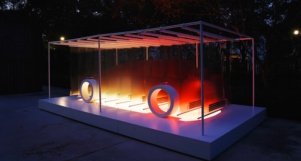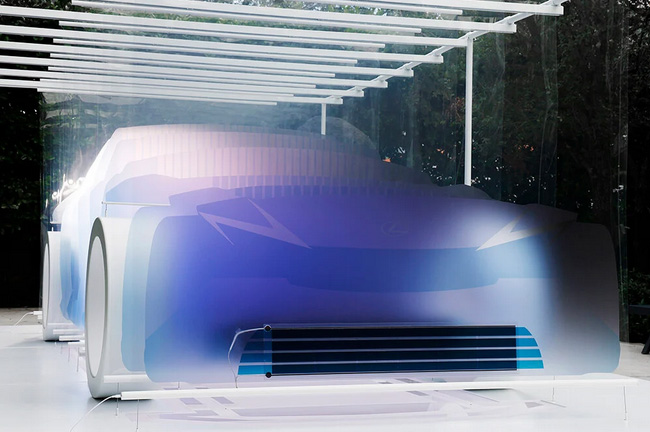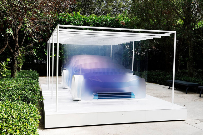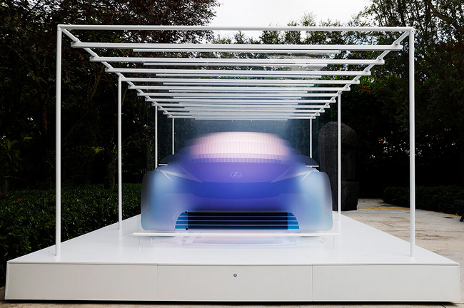 Designboom_ Miami Art Week 2023: Dutch designer Marjan van Aubel enhances the power of her trademark use of solar cells to create the ‘8 Minutes and 20 Seconds’ installation for Lexus. At first glance, visitors at the Institute of Contemporary Art, Miami (ICA Miami) appear to see a true-to-size Lexus Future Zero-emission Catalyst (LF-ZC) concept car sitting in the Museum’s sculpture garden. At closer inspection, the vehicle-like form comes to life as an interactive artwork that reacts in light and sound as people approach – all powered by solar.