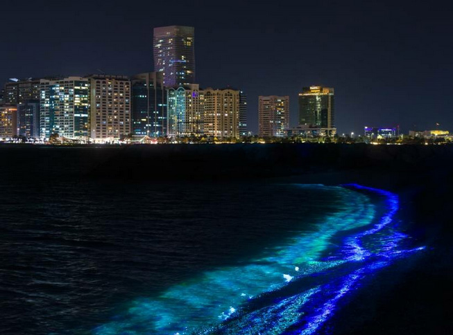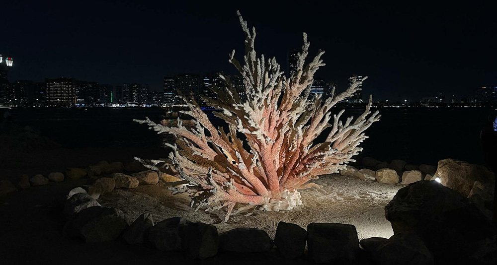 An ever-changing symphony of sound, digital technologies, light, and water, Luciferin Shores by Emirati artist Jumairy celebrates the ethereal beauty of Abu Dhabi beaches, posing reflection on the interconnectedness of all living beings. The artwork responds to the sways and ripples of the waves, mimicking the shimmer of bioluminescent organisms with an otherworldly fusion of neon blues, glistening greens, and phosphorescent purples.