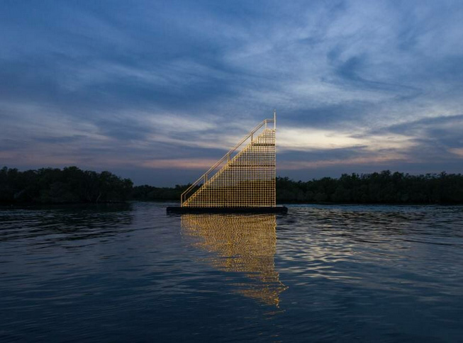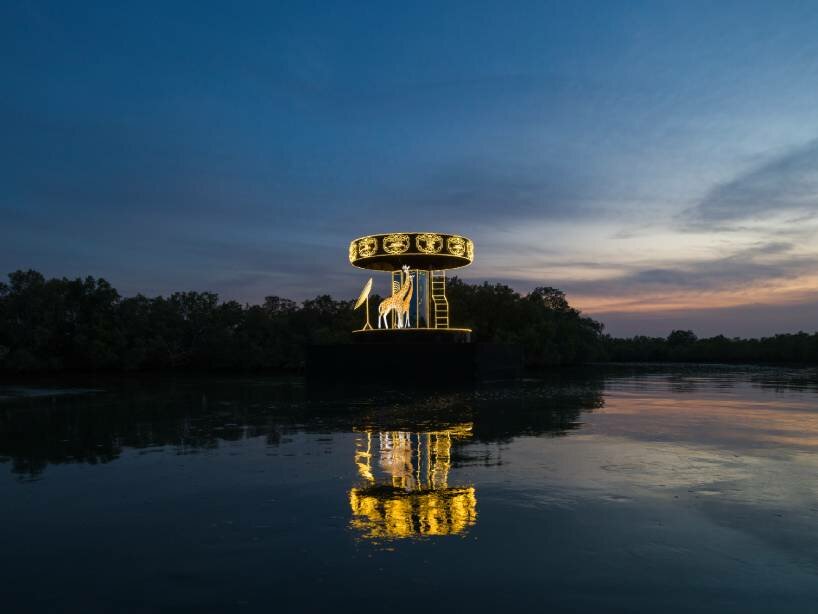 Darawan by an Emirati collective comprising artists Ayesha Hadhir, Rawda al Ketbi, and Shaikha al Ketbi sets three whimsical sculptures afloat amid the Eastern mangroves. A carousel, a trio of female figures carrying utensils above their heads, and a staircase ascending to a door gradually emerge from the waters as visitors sail through, to together explore Abu Dhabi’s traditions, rituals, and cultural practices.
