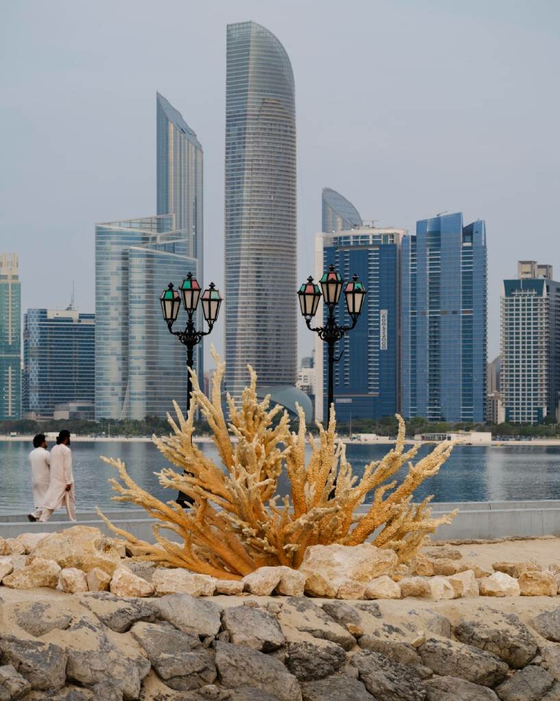 Shezad Dawood’s four-meter-high iridescent sculpture Coral Alchemy (Acropora Grove) sits ahead, bringing the perils of the oceanic ecosystem at the hands of human impact above ground. In collaboration with marine scientist Noura Al Mansouri and machine learning, the London-based artist replicates the growth patterns of Acropora Downingi, an endangered species endemic to the Abu Dhabi region, using AI to promote environmental awareness. The resulting form has been treated with a thermochromic paint finish which causes the sculpture’s color to change in response to ambient temperatures, representing human impacts on reef ecosystems through the warming of the oceans. ‘It almost acts as an accidental barometer,’ he shares with designboom.