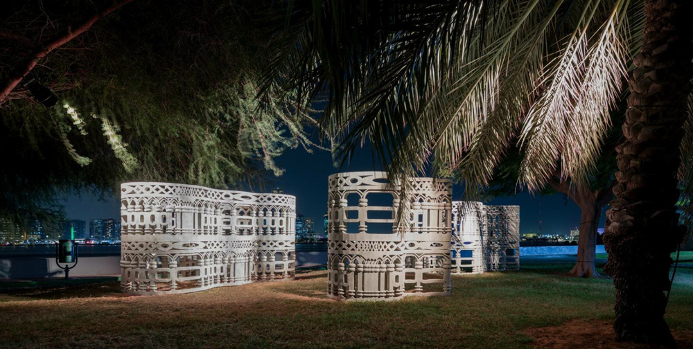 Exploring the visualization of space through time, Chasing the Dance of Alfay by Asma Belhamar encapsulates the architectural history of the UAE. Its walls create an intimate enclosure within a garden overlooking the sea and Abu Dhabi’s skyline, integrating traditional cultural and Islamic motifs that adorn homes in the region and casting shadows laden with nuances of culture and identity in transition.