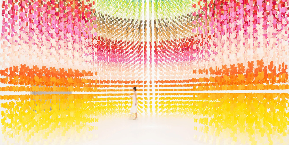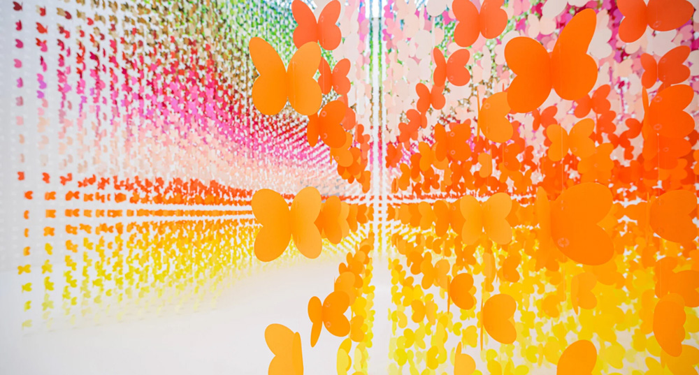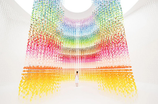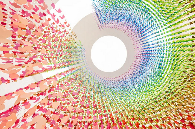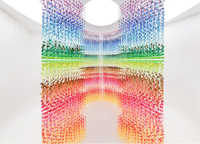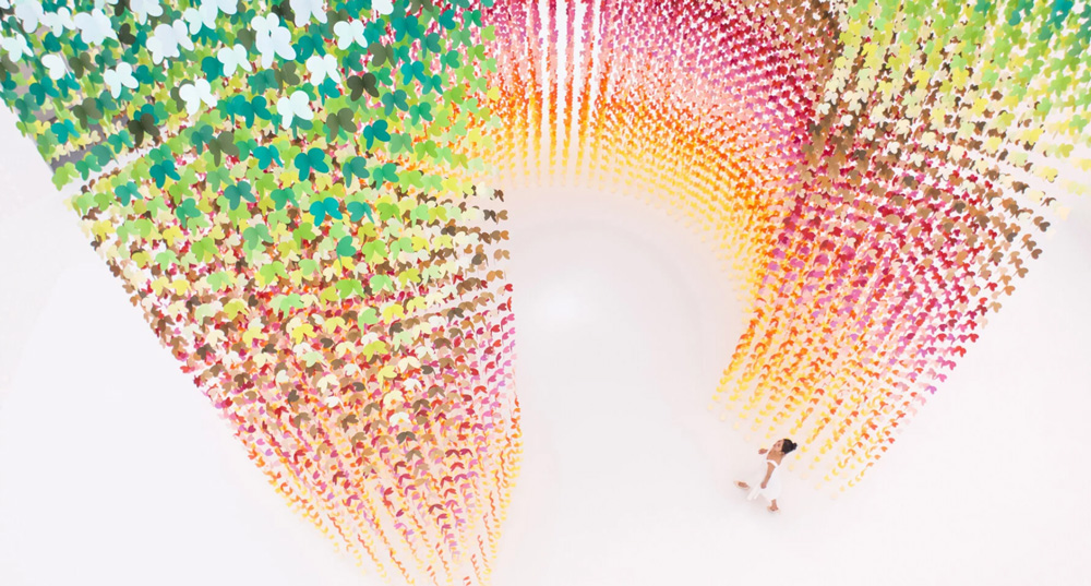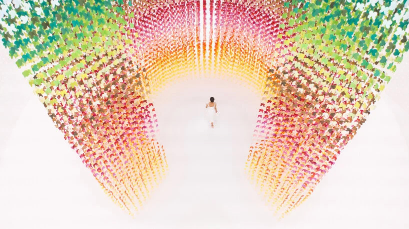 Designboom_ Emmanuelle Moureaux’s ‘100 colors butterflies’ takes center stage at Lancôme’s The Art of Absolue exhibition in Shanghai, themed Perpetual, Beyond Time. No.48 in Moureaux’s ongoing 100 colors series, which started in 2013, the installation aims to evoke emotions through vibrant hues. The piece features 40,000 artificial butterflies adorning a circular volume, creating an immersive experience for visitors. Serving as an abstract representation of beauty and eternity, the display aligns with the philosophy of the beauty brand and its collection. As attendees walk through a path of white butterflies, they are guided to the heart of the artwork, an array of over 100 butterflies in a multitude of shades, varying from yellow, to red, green and blue, and soaring over 10 meters high.