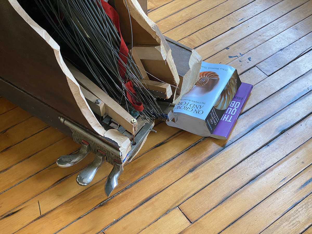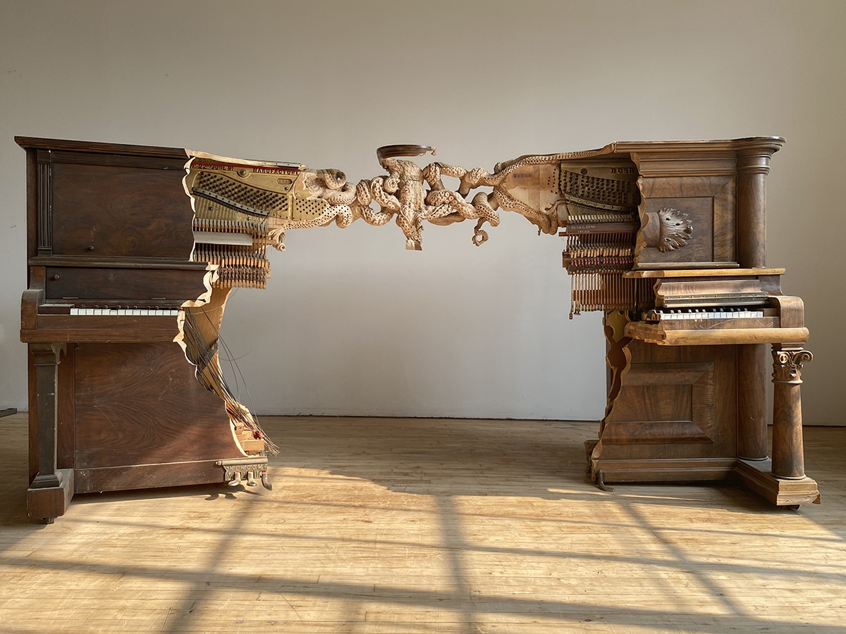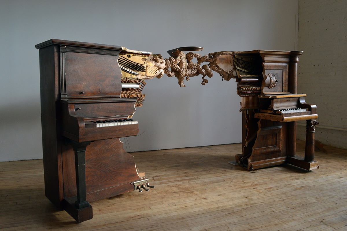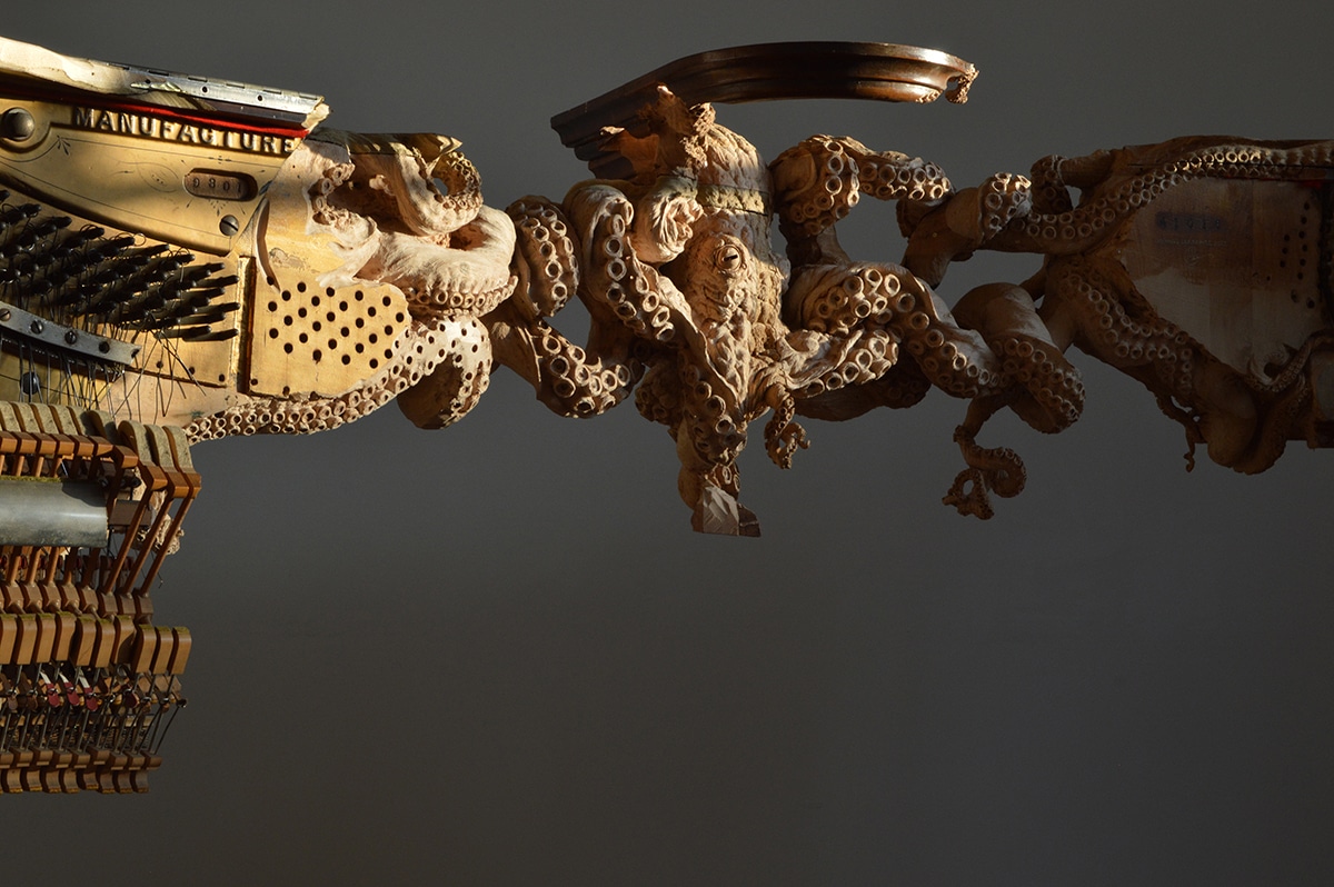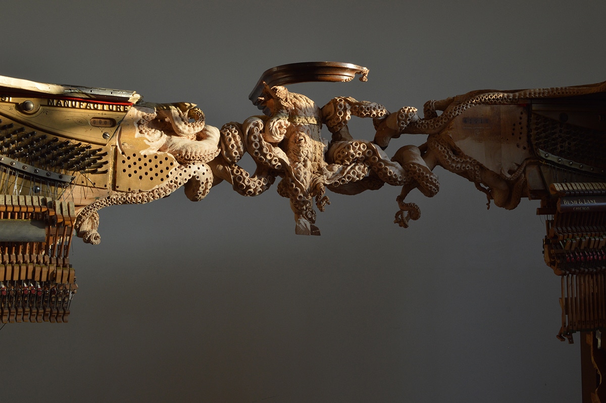 “It is interesting to transpose a musical instrument into a sculptural object, a transposition that sacrifices some expected potentials for other surprising ones,” he confesses. “I needed to carve something worthy of the ‘sacrifice' of two pianos, something that would reveal their value in a different currency—not sound, but thought, and visual intricacy. The beauty of the mechanism of the instrument, and anatomy of the Octopus was a resonance (to use a musical term) that I hope the sculpture captures.”