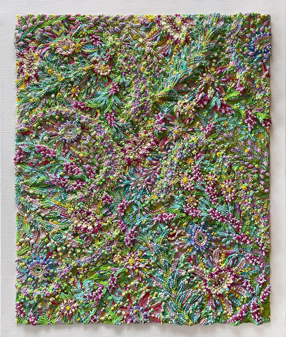 Much like robotic surgery, his innovative machines allow for fine control and placement of paint while Santín remains in command. The resulting paintings technically, and conceptually, are well-calibrated, intentional, and forward-thinking. With little of the source material remaining, they petition for and are rewarded with extended observation time by the viewer, in support of the premise that it’s not just the slowness of creating that reward, but also that of looking, evident in Elastic Somnambullism, where with its pictographic floral reference, one gets lost in the surface details. The small canvases, some likened to single-color paintings, and others multi-toned, are two distinct series. One is a floral archetype, with a limited multi-toned pallet, the other, an organic vibration of monochromatic broken lines, a tribute to Agnes Martin and Robert Ryman. They are not studies for the larger works but rather highlight the technique through a restrictive palette and narrative.