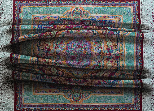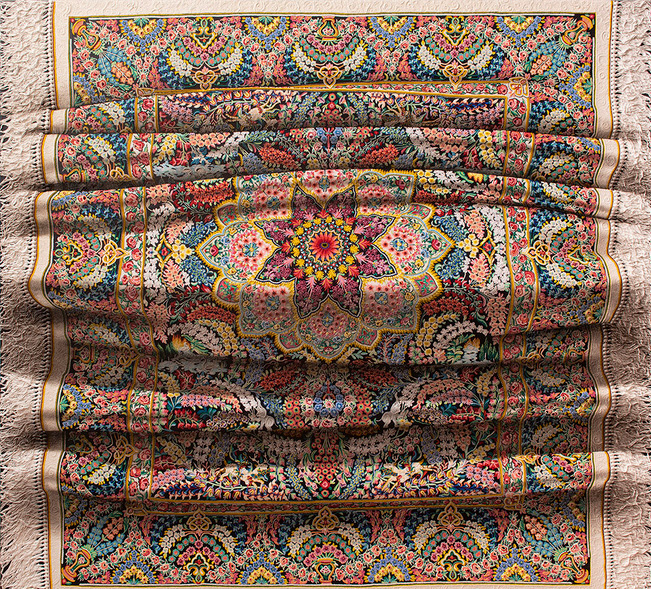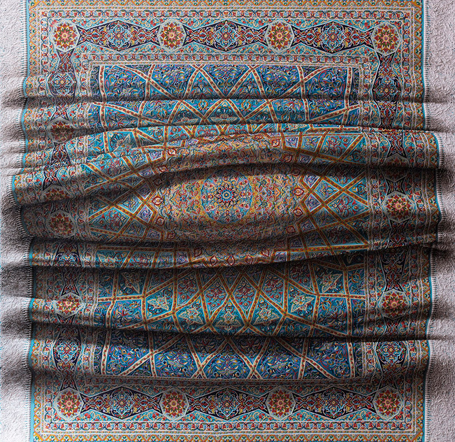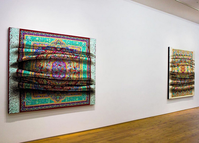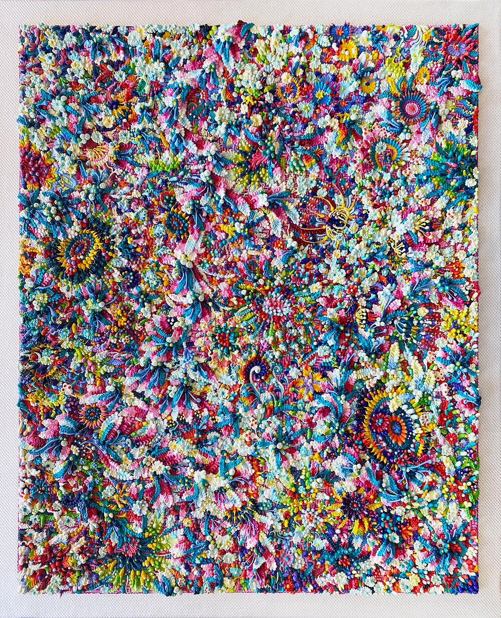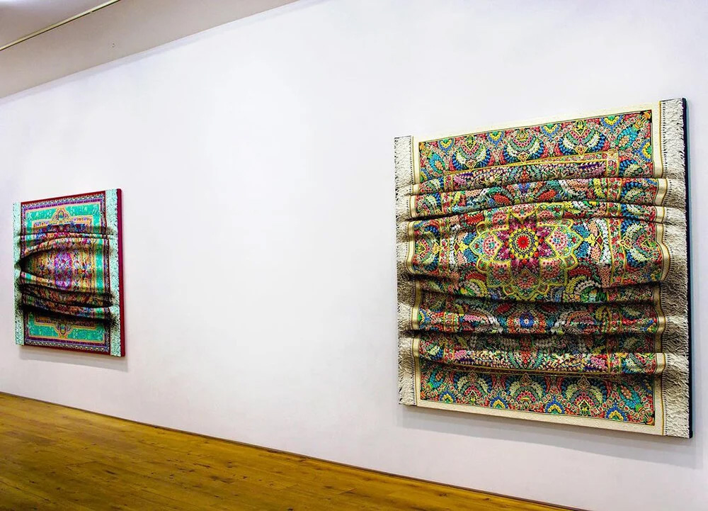 Delving deeper into the exhibiton at Marc Straus gallery, Antonio Santín’s artworks draw a parallel with Milan Kundera’s Slowness (1995), a novel that contrasts the lightning speed of modern life with the slowness of the 18th century. Kundera’s Slowness and Santín’s Echo Chamber, Poligamia, and Supernova, among other paintings in the show, symbolize how impactful slowness can be; a small thoughtful volume, a surprisingly slow read. Indeed, Santín’s paintings are labor-intensive and can take up to nine months to produce. With actual rugs and imagery, he begins with researching and maneuvering source material: the study of textile and how it deforms when it hides an undefined volume. A low-tech approach to image rendering on a primed surface follows, then comes the paint application, changing and blending the oil, changing the pressure in the compressor machine – as every oil has a different density–, drying, layering, revealing, hiding, and repeating. The process ends with applying chromatic shadows to complete the painting. A work of precision and innovation, leaving little room for unexpected outcomes.