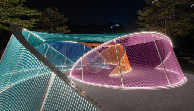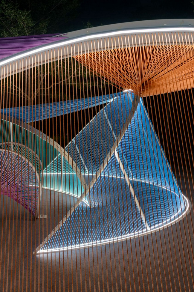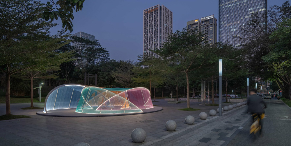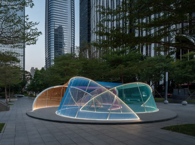Designboom_ At the invitation of 2023 Glow Shenzhen Organizing Committee, MARS Studio designed a vibrant set of installations to illuminate Futian District Citizen Square. Isle of Light is composed of four curved steel structures with staggered heights and ups and downs, unravelling in a spiralling semi-enclosed form. The frame intricately weaves strings into a thin and hazy display surface, forming a miniature ‘urban island’ set against the dynamic backdrop of light and shade.