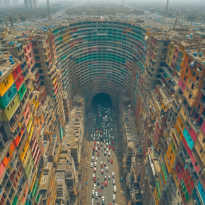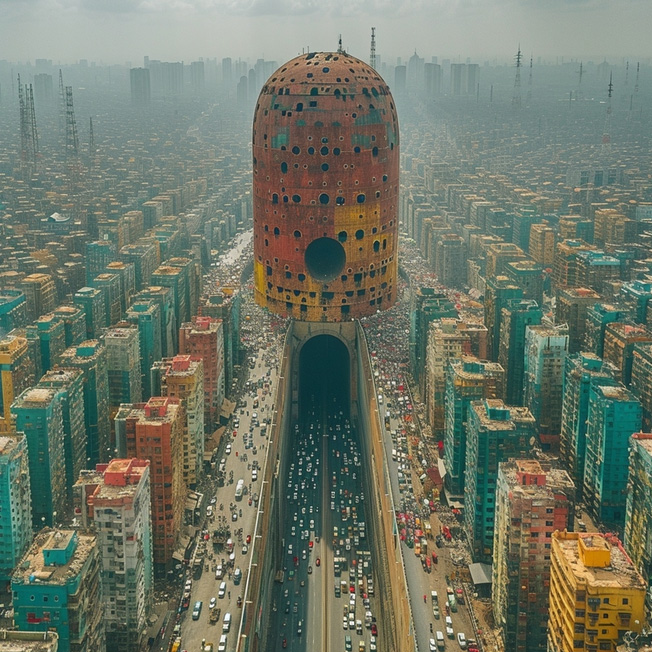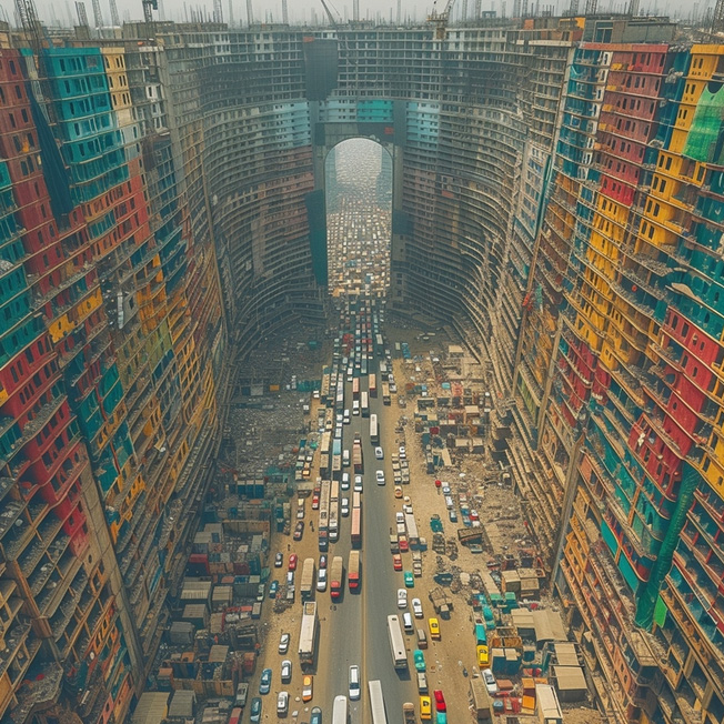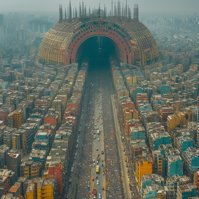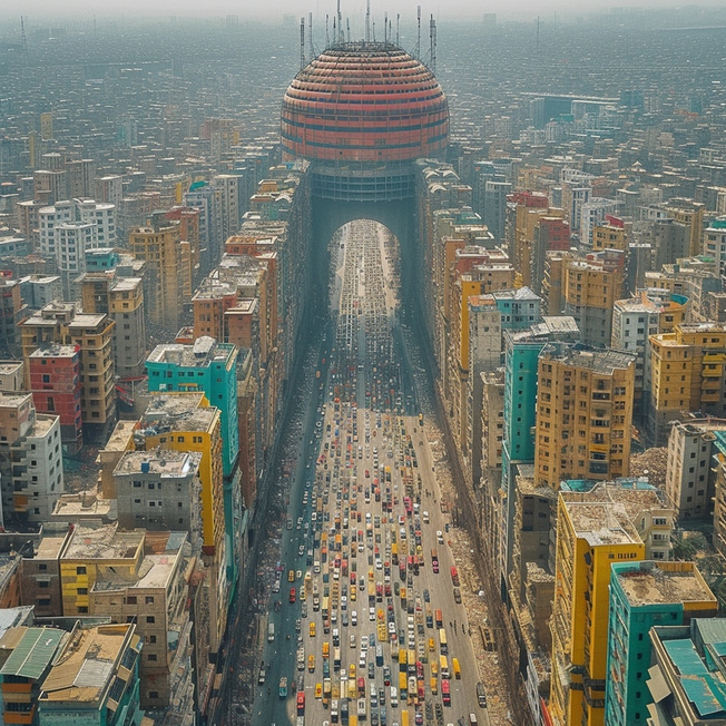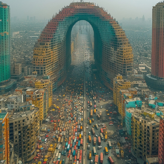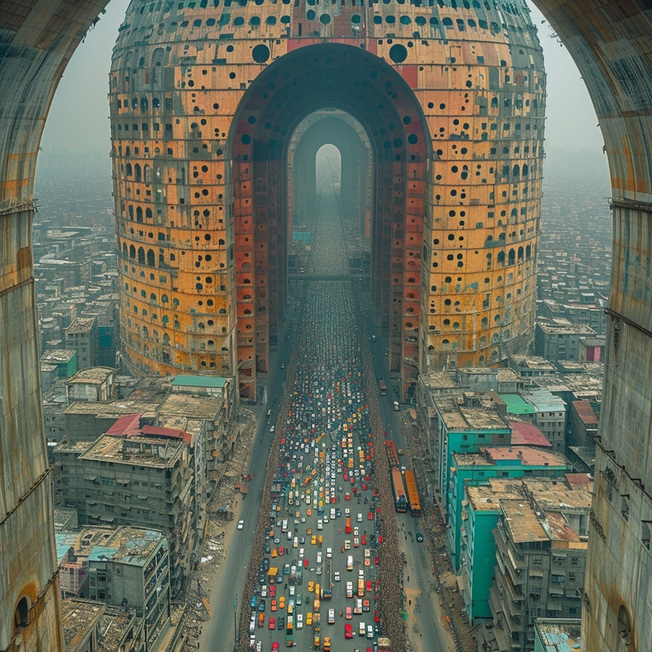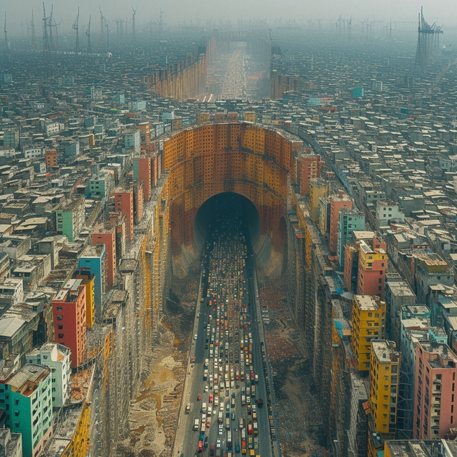 Designboom_ THE (OTHER) LINE is the counterpart, the reversed image of NEOM’s THE LINE: a congested and busy infrastructural line, punctuated by elements of concentration and representation of the administrative authority, which acts as the only glue and connection to an infinite city spread without interruption across the territory. While Saudi Arabia envisions an urban landscape that is mimetic, sophisticated and aims to hide its true nature behind the technological precision of a mirrored facade, AI-DA’s AI-generated cityscapes are brazen and cannot help but show their true nature by replacing the natural landscape. As much as the former celebrates 100% renewable energy, the absence of machines, and polluting emissions, the latter will not be able to give up fossil fuels, traffic, and pollution in order to support its development and survive.