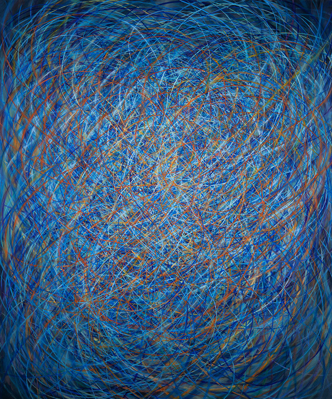 ‘We think of time as linear. I don’t think it’s linear. On a quantum physics level, there is no time, at all. It’s strange, the concept of time and space,’ Shane Guffogg tells designboom.‘How do you paint this moment of time? Is it possible? Each of those brushstrokes is a passing of time. There are thousands of lines in those paintings and each of the colors summons up very sensorial memories that don’t have a specific time or place but have a general feeling. So, I’m creating my tapestry of memories and feelings that become fused into a singular moment.’