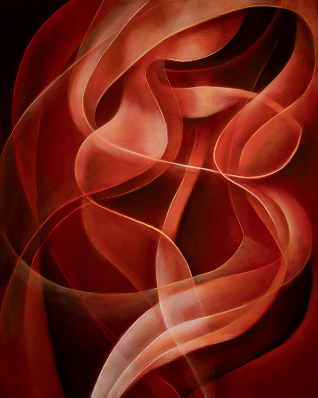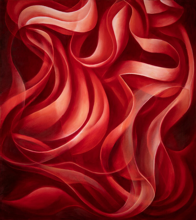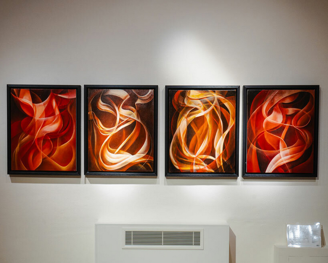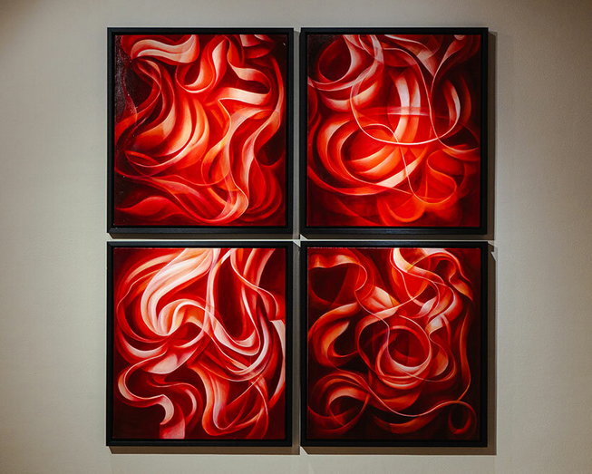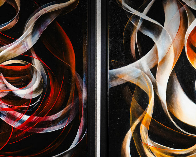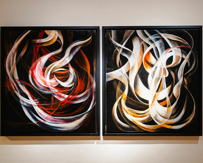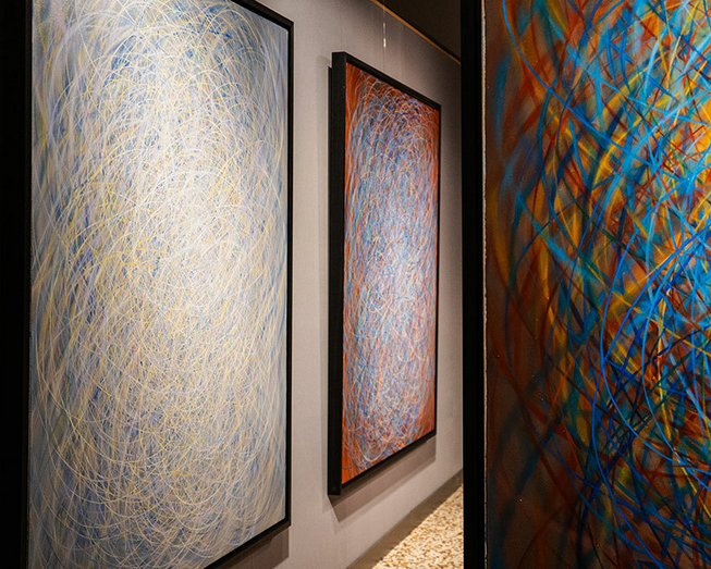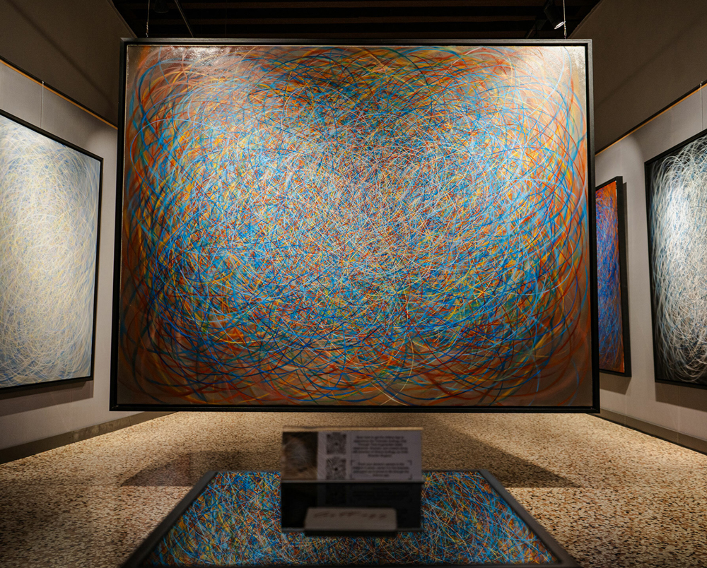 The exhibition is divided into two rooms, each inspired by different passages from T.S. Eliot’s writing. It features elements that create a direct dialogue between the poet’s celebrated work and the artist’s canvases through the use of augmented reality (AR) and artificial intelligence (AI). By incorporating AR and AI, Guffogg expands the possibilities of art, inviting viewers to engage with the works in a meaningful and immersive way, encouraging them to look beyond the 24/7 age of information. In the first room, visitors utilize a mobile screen to observe the paintings, witnessing the lines and circles move in rhythmic patterns, while glimpses of Guffogg at work blend into the vibrant dance of color and form.