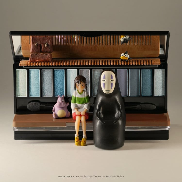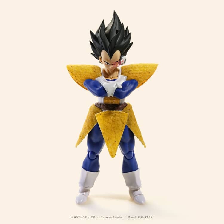 Pop culture is also a massive element of Tanaka's work. He recently included some beloved characters from Japanese productions, like Dragon Ball and Studio Ghibli. In one of his most clever recreations, Chihiro from Spirited Away rides the train; but if you look closely, the windows are actually made out of blue eyeshadow. Meanwhile, Nobi from Doraemon cries with the help of two slices of onion; and the golden details of Dragon Ball‘s prideful Vegeta‘s suit are actually pieces of tortilla chips.