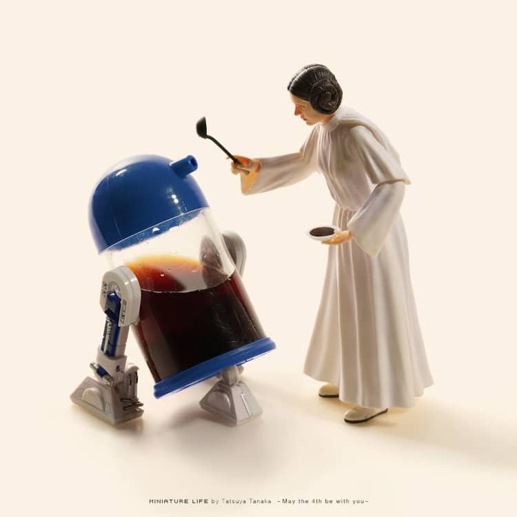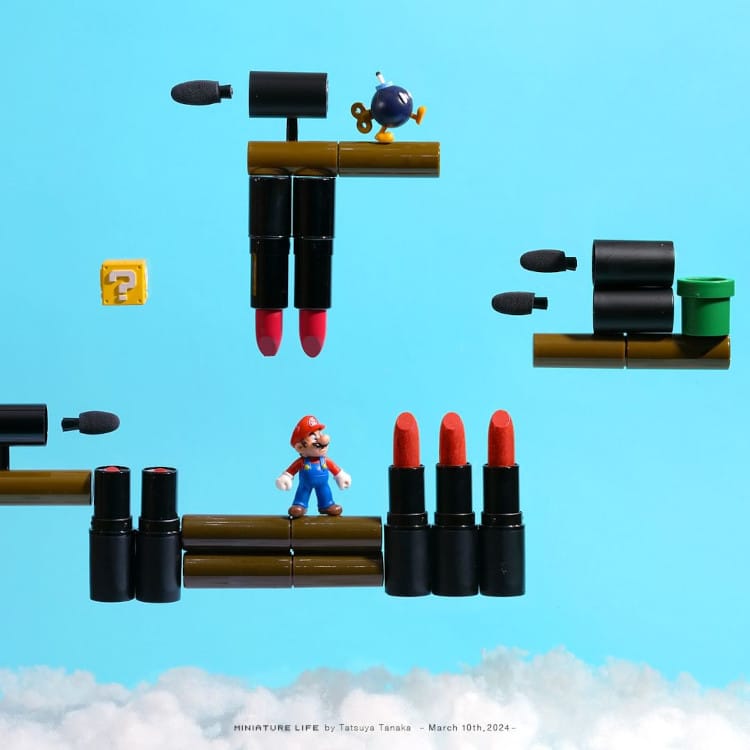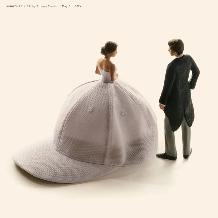 Tanaka's miniature compositions are part of his never-ending Miniature Calendar, a project that has seen him create a new scene with household objects and tiny people daily since 2011. His images are influenced by anything from pop culture and world events to seasons and holidays. Lately, his feed has taken great inspiration from spring with cherry blossoms appearing in many of his leisurely compositions—including one of bikers by a riverbank and another of a serene carriage ride by a sakura tree. He also celebrated Star Wars Day with an R2-D2 sauce dispenser and Mother's Day with a heart bouquet.