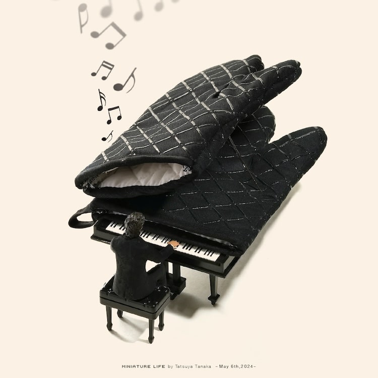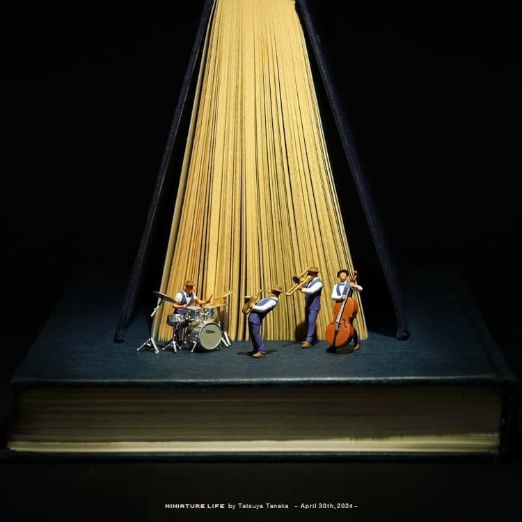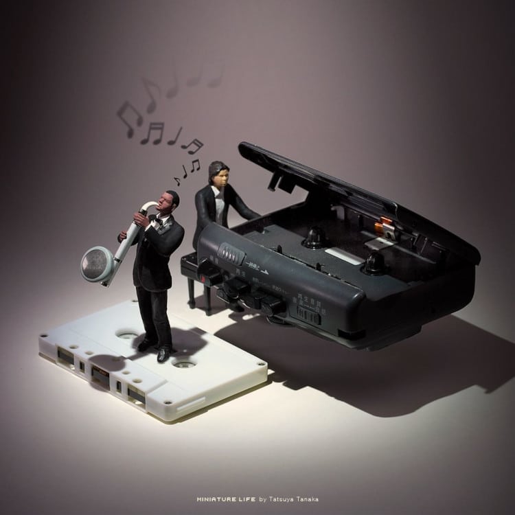 Despite his use of everyday objects, Tanaka's miniature scenes exude a sense of wonder and adventure. In some of his latest creations, his tiny characters visit a spoon-based waterpark, take a brush boat to go dolphin-watching, and play a game of table tennis on a deck of cards. And since leisure is enhanced by a little culture, his cleverly crafted images take us to a jazz concert lit up by the pages of a book. And he has another music-themed piece where a piano is made out of a cassette tape. His imagination is limitless!