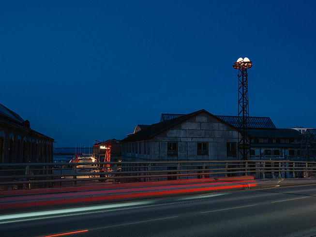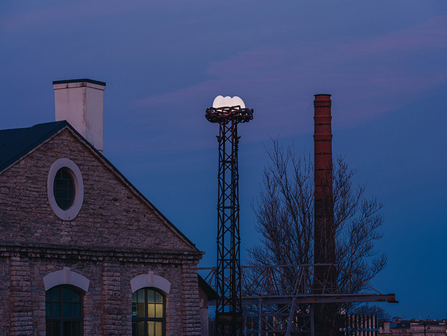 Designboom_ Once a major submarine shipyard established before World War I, the Noblessner port in Tallinn, Estonia has now been turned into a seafront quarter open to the public and to the sea. Here, a large elegant, illuminated bird’s nest perches at the top of a former lighting mast and combines metal and light art. Aptly titled Nest, the installation is commissioned by real estate developers Merko Ehitus Eesti and brought to life by Estonian design agency Velvet and lighting design studio UN-LIKE. It is crafted from repurposed materials, giving new meaning to the long-unused structure that once littered the environment. Its conception is inspired by five-year-old Stina Onemar, who envisioned a bird’s nest adorning the rusted mast, realized to enliven the urban space and instil appreciation for old and disused industrial objects.