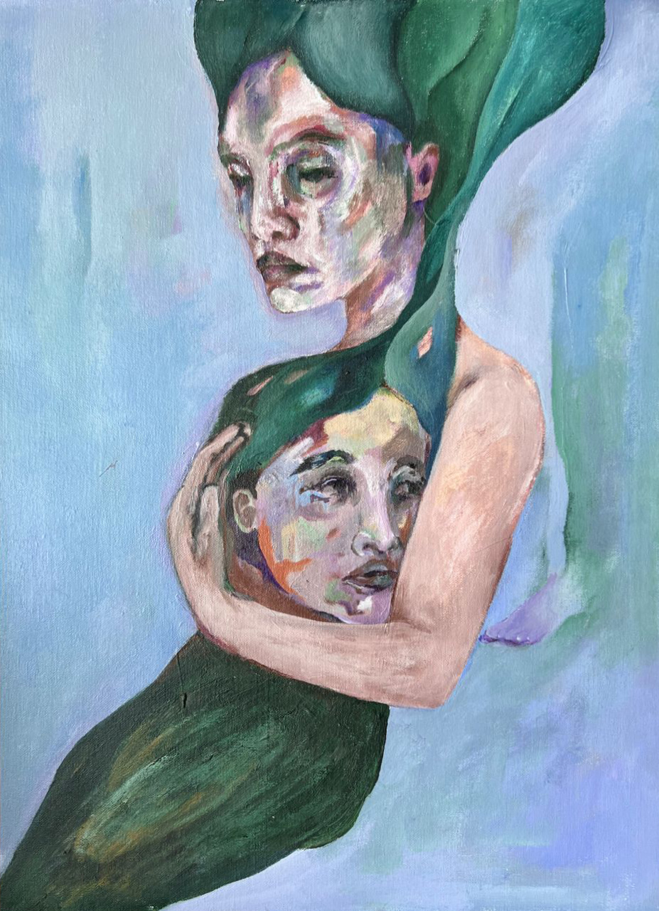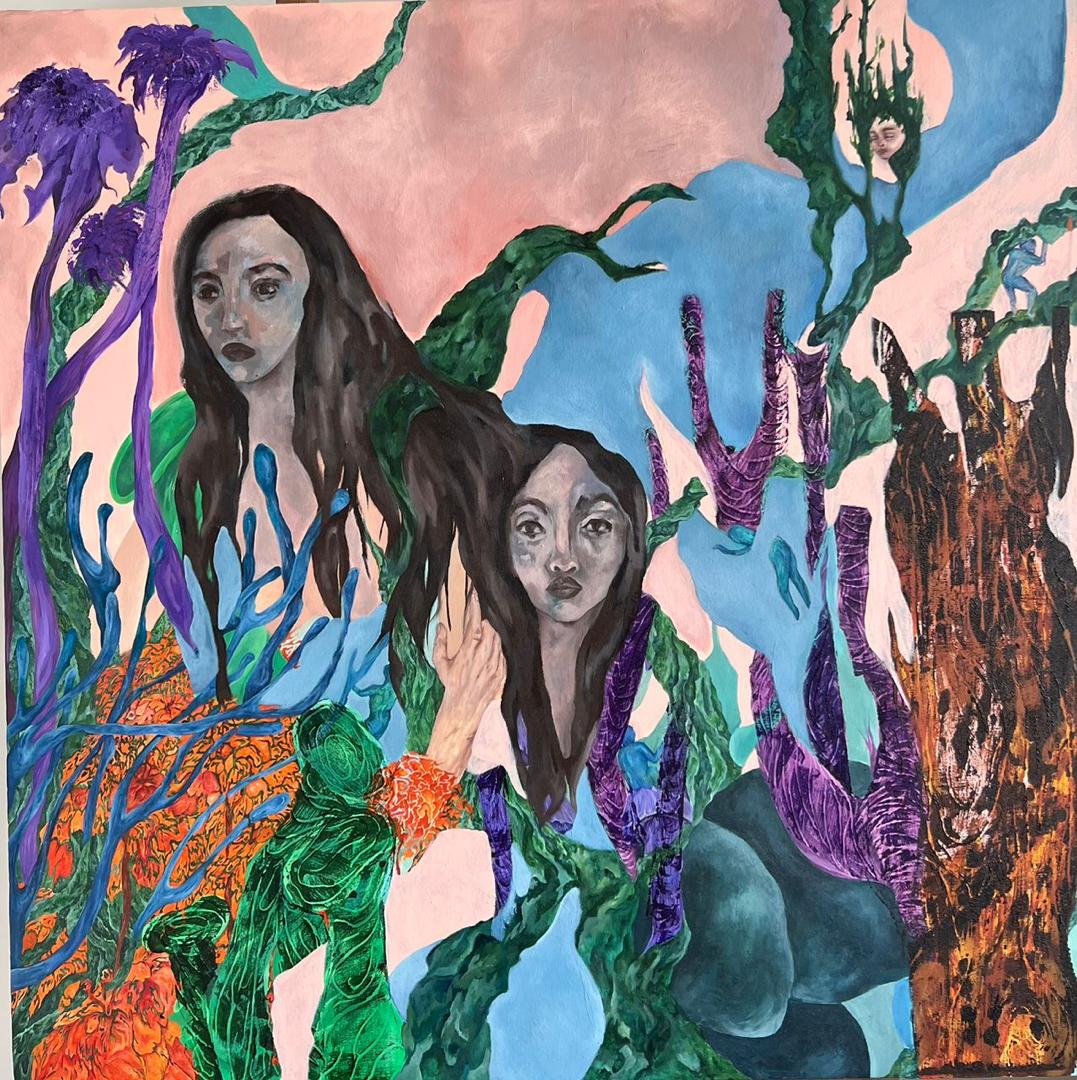 One of my favorite pieces shows a woman attempting to uplift herself and other women who are entangled in their own complex worlds of challenges. This work was initially inspired by Eugène Delacroix's painting "Liberty Leading the People." In this piece, I used muted and chaotic colors for the lower part and more vibrant and cheerful colors for the upper part to depict hope.