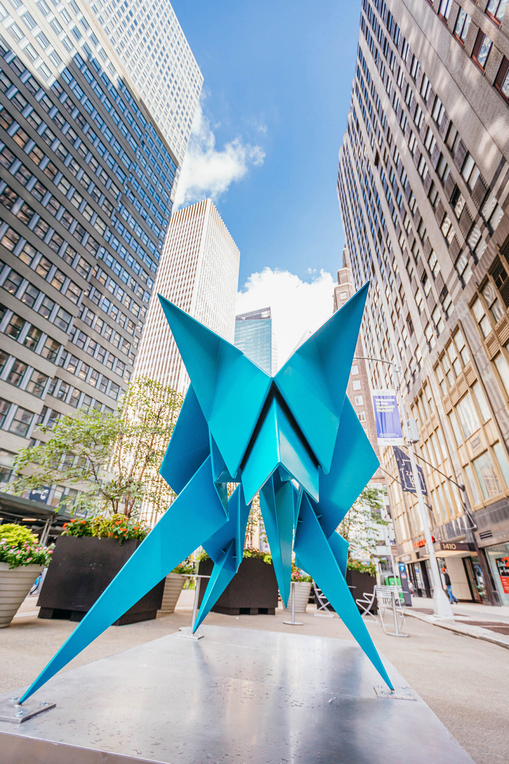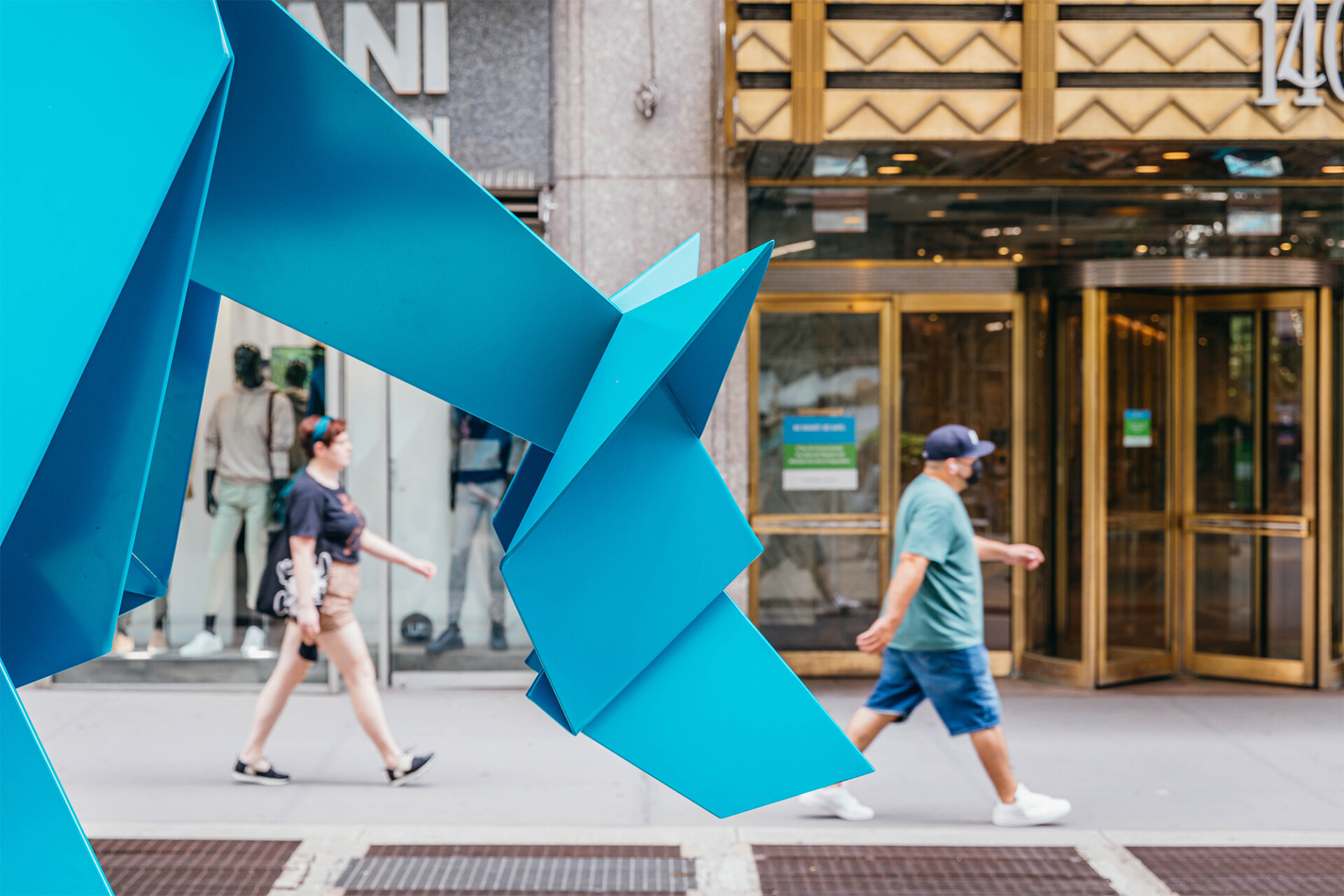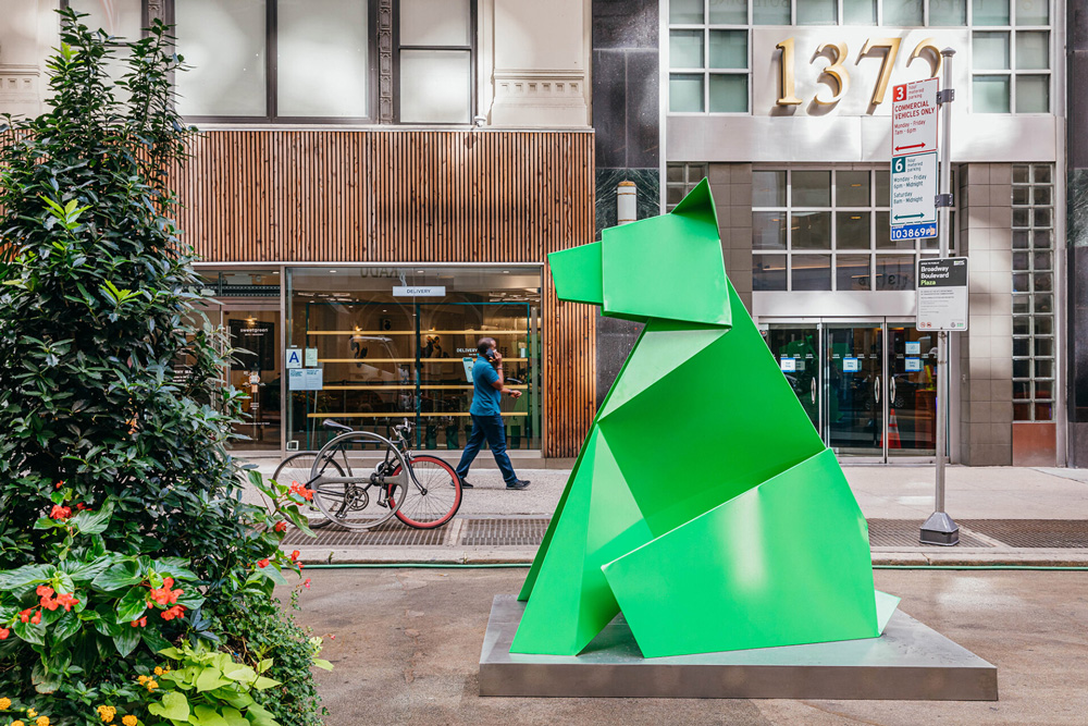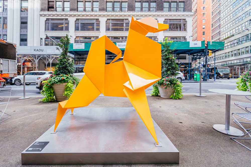 Beautifullife_ Thanks to Gerardo Gomez-Martinez (aka Hacer), the public plazas on Broadway in New York City’s Garment District are now a zoo of origami-style animals. The Mexican-American artist installed a series of powder-coated steel sculptures that loom over dining areas and walkways as part of Transformations . Commissioned by The Garment District Alliance, the project consists of seven creatures that vary in size, including a yellow dog, a magenta elephant, a green bear cub, and two turquoise rabbits and coyotes, one of which extends 14 feet from nose to tail. If you’re in Manhattan, stop by the plazas between 36th and 39th streets before November 23 to see the bold animals in person.