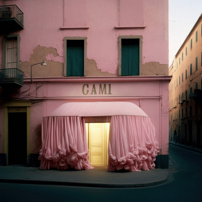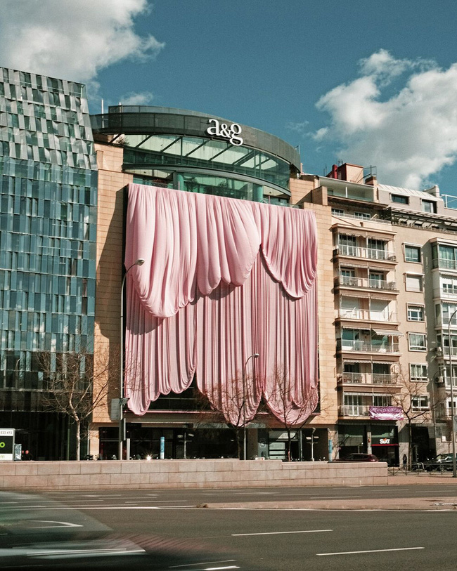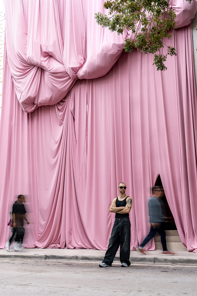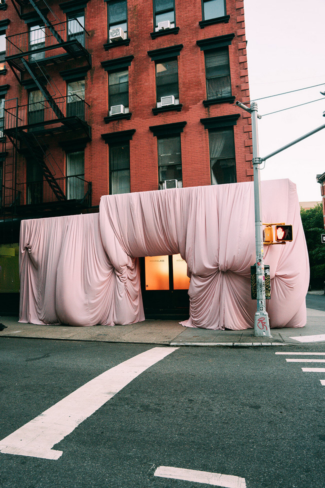 In March 2024, only a month after his Jeddah installation, Reisinger landed in Madrid to create a third physical iteration for a private banking building, A&G. The layering aesthetic is equally present in this piece, but instead of giving off the impression of frilly clothing, he recalls the draping of curtains as they get raised before a show. Moving on to April, the artist completed his first interior Take Over in Venice for Golden Goose HAUS, revealing a much more intimate and interactive iteration. Fast forward to July, and Reisinger hits the cosmetics scene, collaborating with Hourglass Cosmetics to celebrate the brand’s latest product drop — The Unreal Liquid Blush collection. From July 12 — 14th, 2024, the NoLiTa facade in New York City was cloaked in undulant pink drapery, bringing a dramatic blush to 14 Prince Street.
