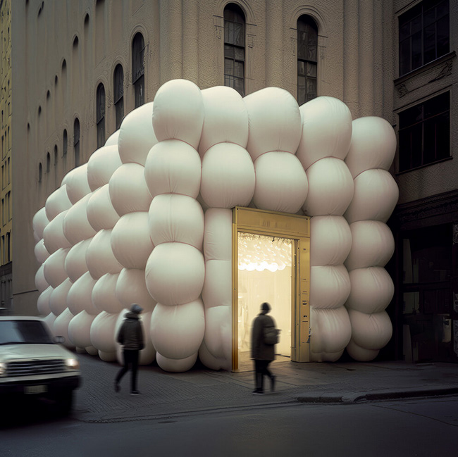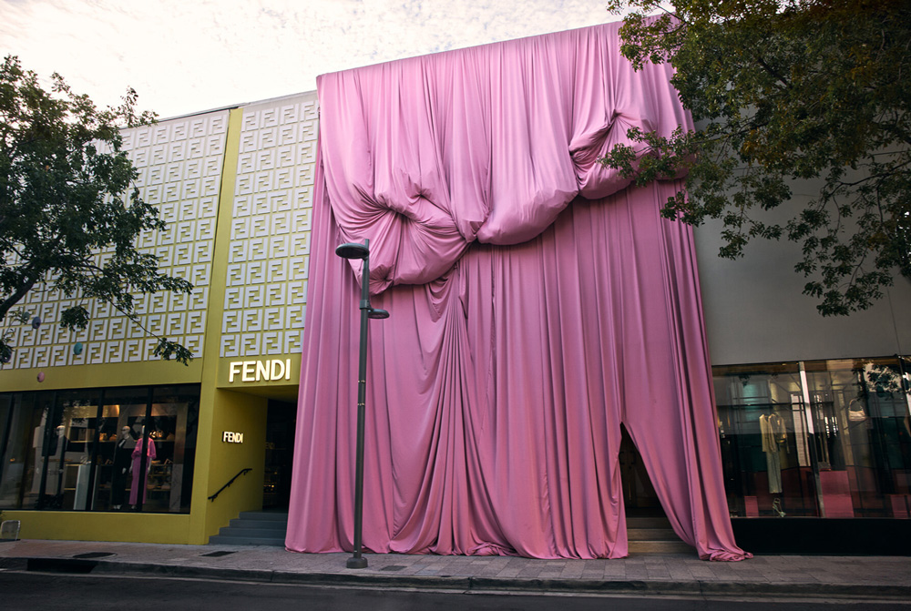 A few months after revealing the viral digital series, Andrés Reisinger presented his very first physical iteration of Take Over during Miami Art Week, which ran from December 4-10, 2023. The billowing pink installation, developed in collaboration with Miami Design District, draped over a Fendi storefront, looking practically indistinguishable from his virtual designs. When asked about this shift to a collaborative model, the artist explains it was ‘the classic case of ‘an opportunity presented itself‘. Following his Miami piece, similar opportunities began to pile up and further East.