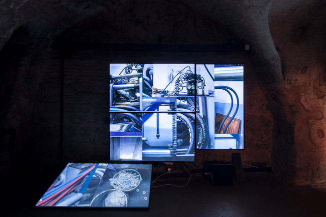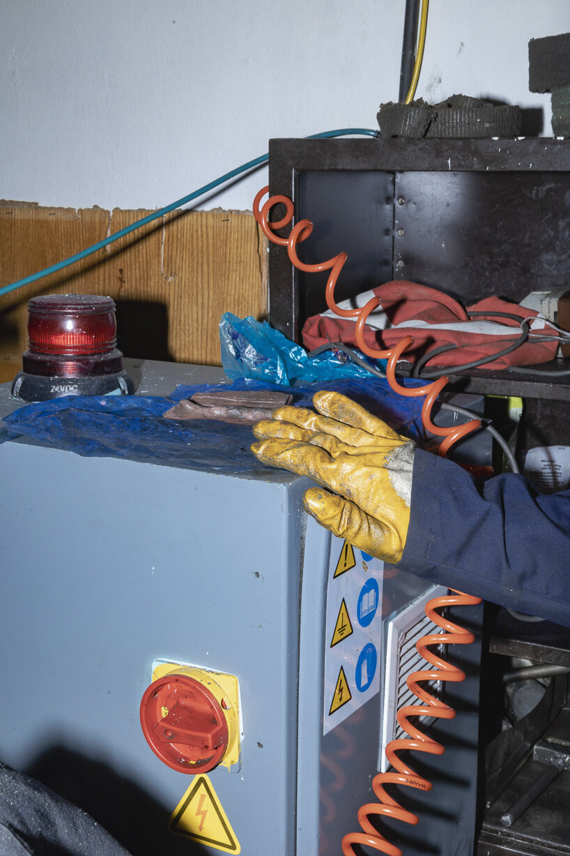 Buşra Tunç investigates environments such as metal workshops, paint shops, and plastic injection molding factories, examining how traces of time and material manifest in architecture, human bodies, and psychology. The exhibition reflects on concepts of invisible labor, interrupted time, and lost matter. In the basement, the Turkish artist sets up a room where a functioning machine processes raw material, injects it, and molds it. This process is captured in videos that trace the machine’s coordinates, highlighting connections with the human body through vibrations, tremors, interlocking, and separations of machine parts. The circulation area features production residues, while a rubber spill in the main area exemplifies the irregular materials the artist uses to question normative contexts and daily functions.