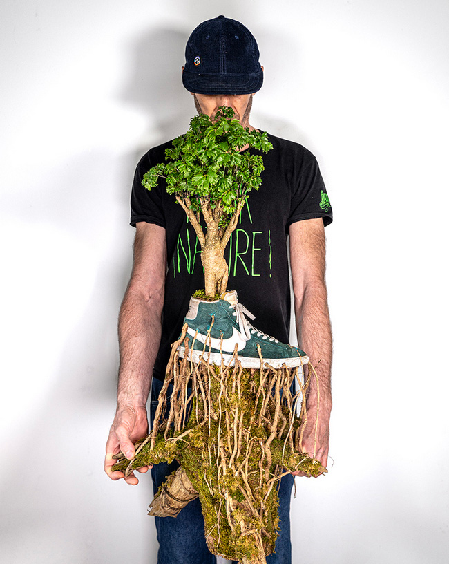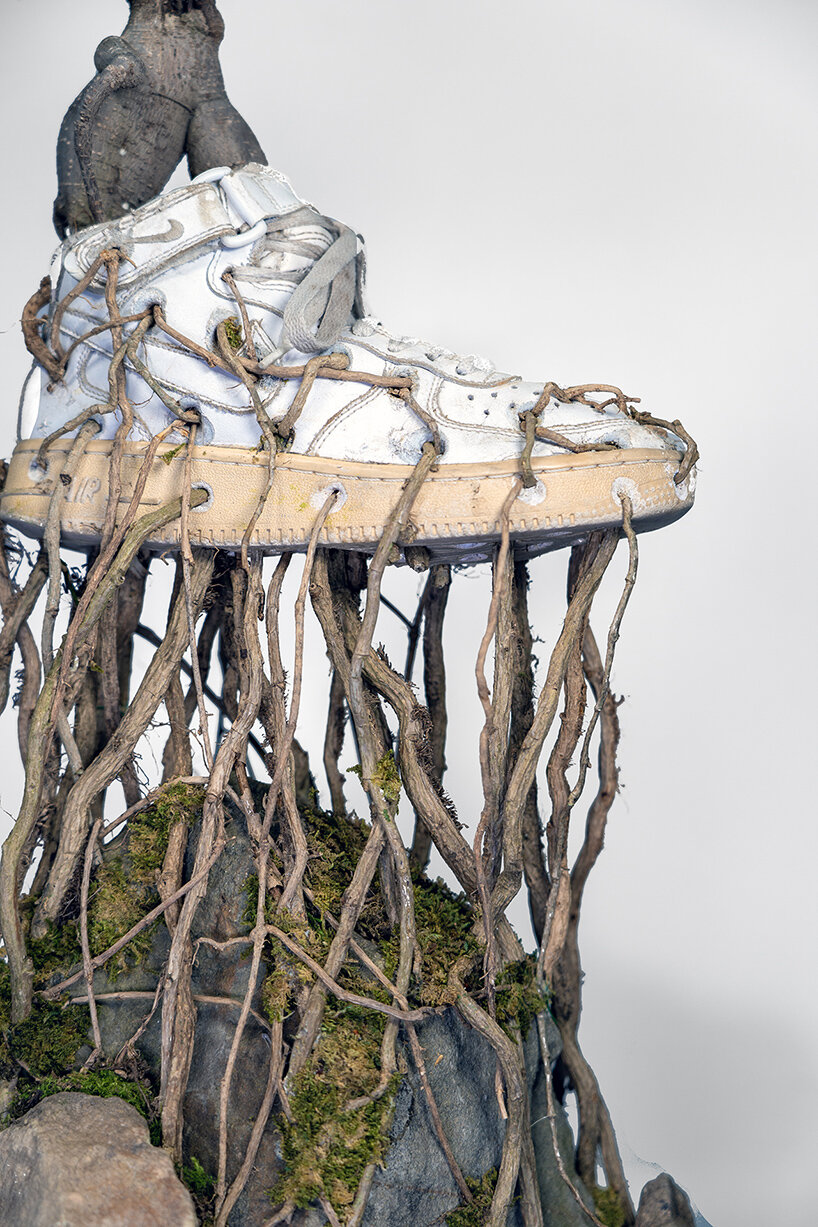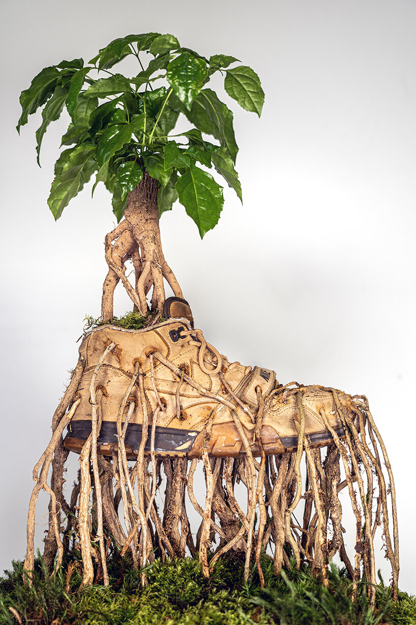 Designboom_Christophe Guinet, also known as Monsieur Plant, reveals an excerpt from his curious botanical collection — a series of Bonzaï trees planted in sneakers where we can see the root system that runs through it from one side to the other. With Bonzaï Sneakers, the Parisian artist continues his playful explorations of how footwear and nature can intertwine to create whimsical artworks, as seen in his Sneakerium and Just Grow It series. With this project, the plant sculptures are reminiscent of the mangrove ecosystem that develops along the protected coasts of tropical and subtropical areas.