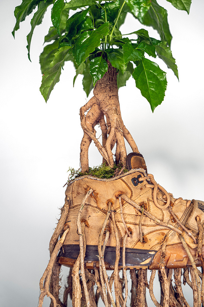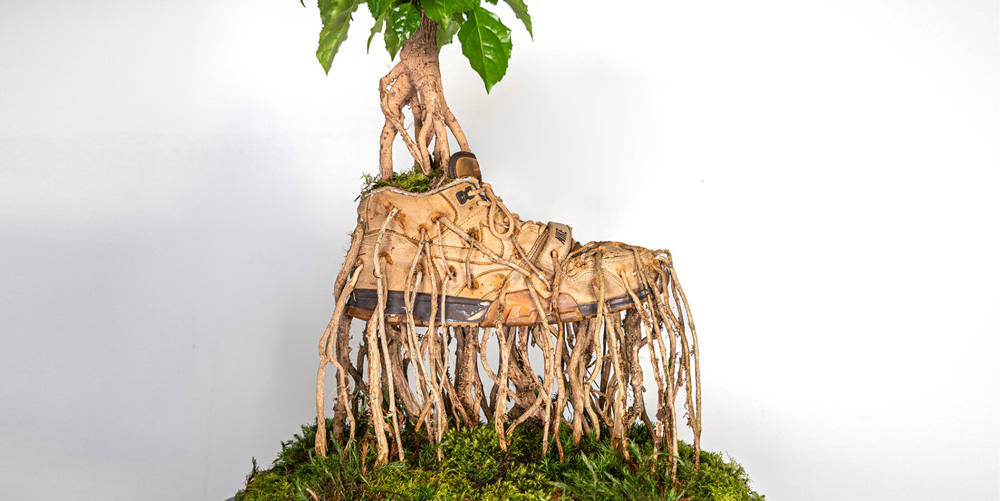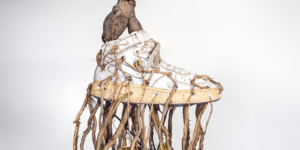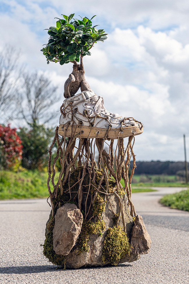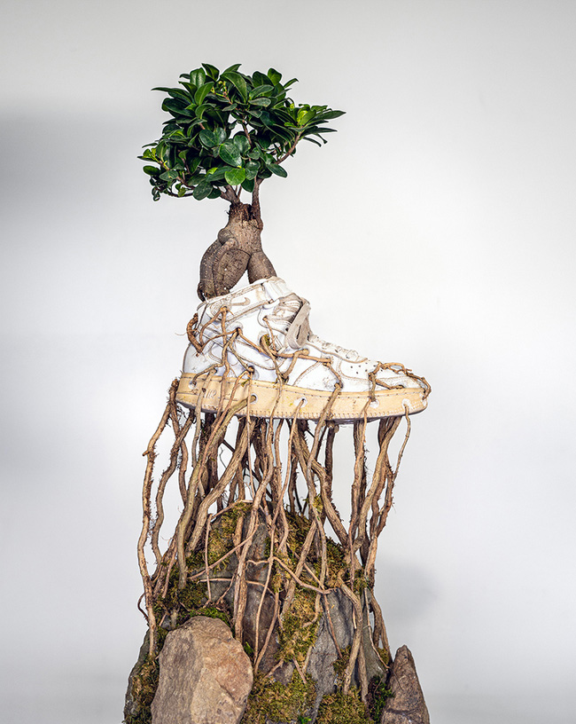 Monsieur Plant has come closer to a subject that today constitutes the common thread of his works: the reappropriation by nature of cult objects created by man. ‘It is poetic to see this nature take back what was once its own,’ says the artist. Each work of Bonzaï Sneakers contorts a plant into a NIKE shoe, its roots and weeds puncturing through the leather.
