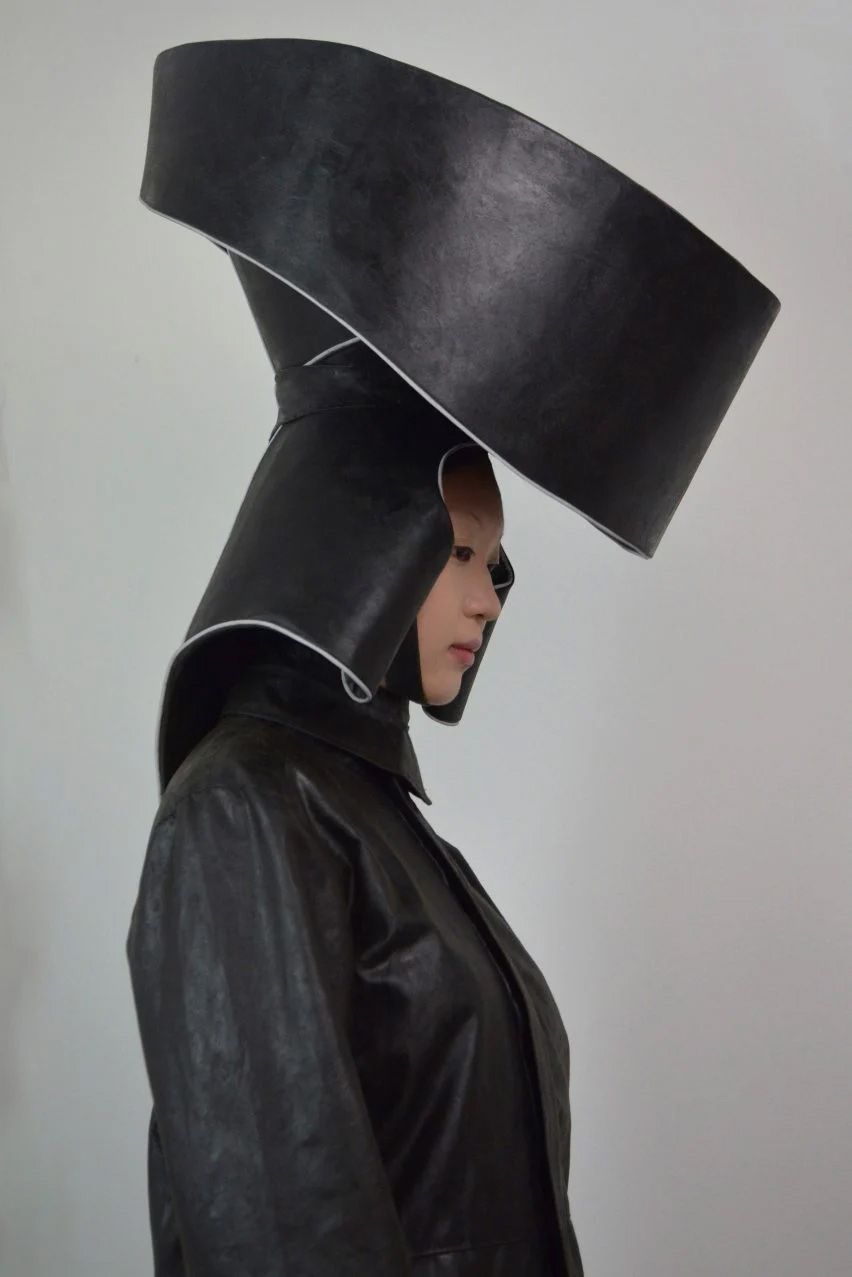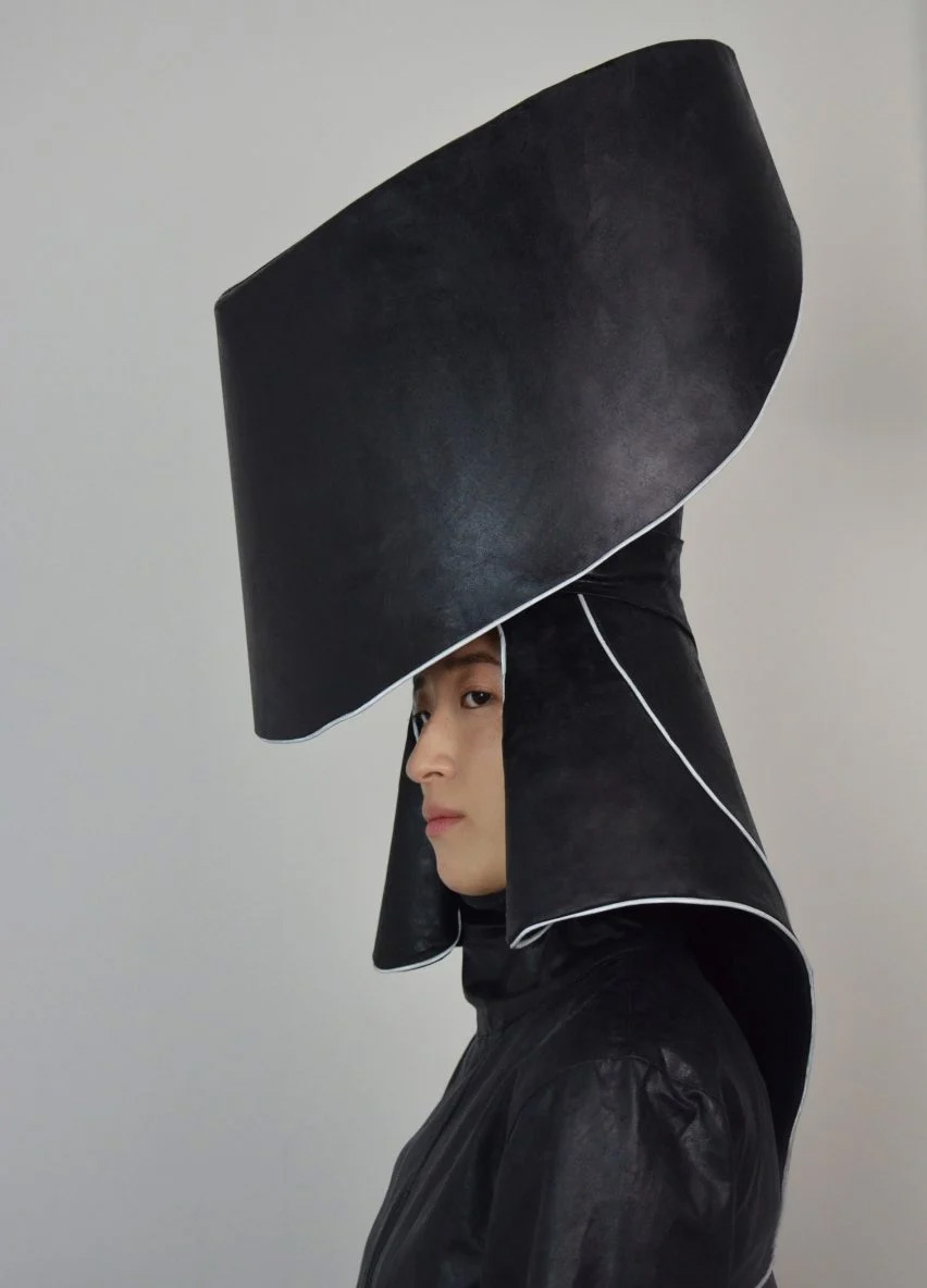The shape of the headwear was informed by the attire of lay sisters – women who live in a convent, but are not members of the clergy – for their works of charity and devotion to social causes.