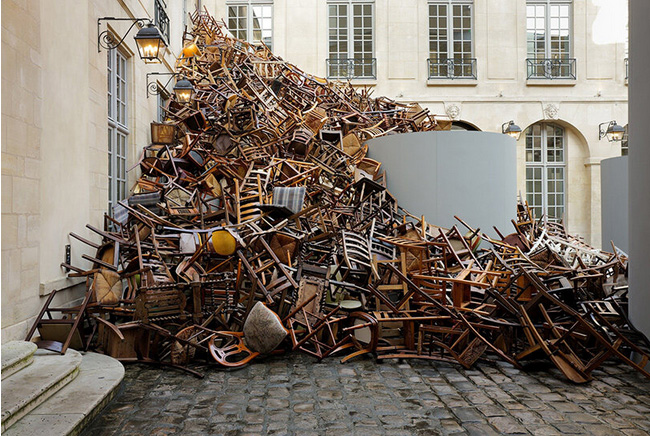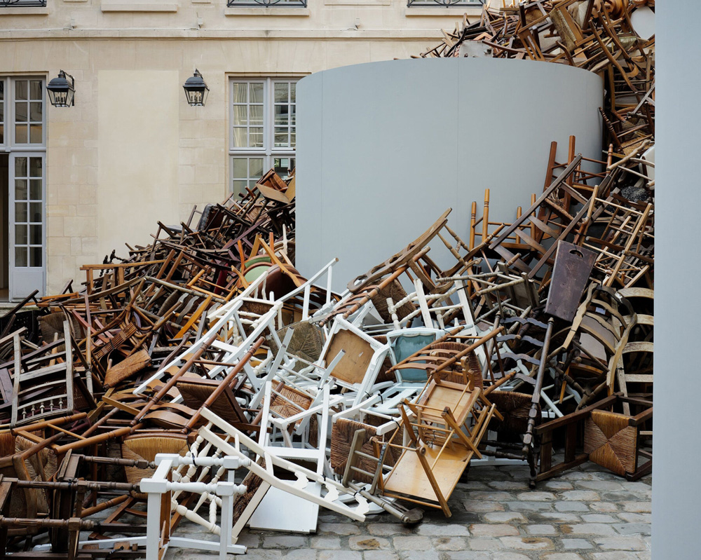 The installation takes its name from the hundreds of wooden chairs spilling out from a window into the courtyard below. These chairs create the illusion of a large wave, a dynamic mass of furniture crashing through the architectural space. The wooden chairs, a recurrent material in Kawamata’s work, form a dramatic and chaotic visual as they surge around large grey cylinders, further enhancing the effect of movement and displacement.