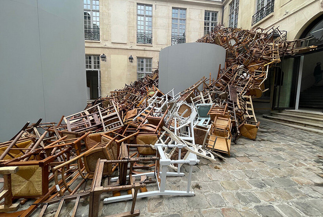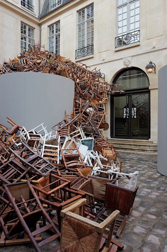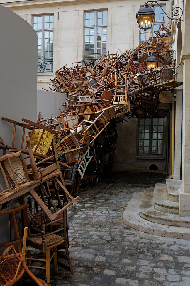 Set within the courtyard of Dover Street Market Paris, the installation takes full advantage of the intimate, historic setting. The space, flanked by pillars and designed with an eye toward organic integration, amplifies the impact of the tumbling chairs. The collaboration between Kawamata and the venue highlights the interplay between art and architecture, while also nodding to the cultural significance of the location at 35-37 rue des Francs Bourgeois.