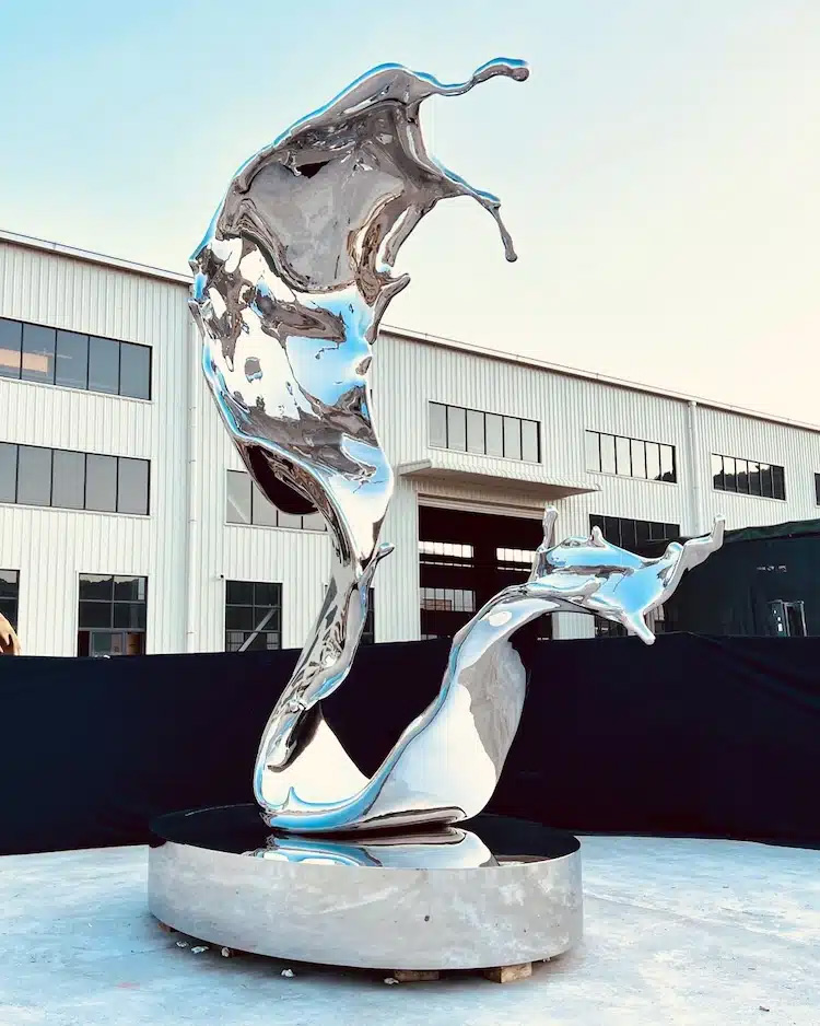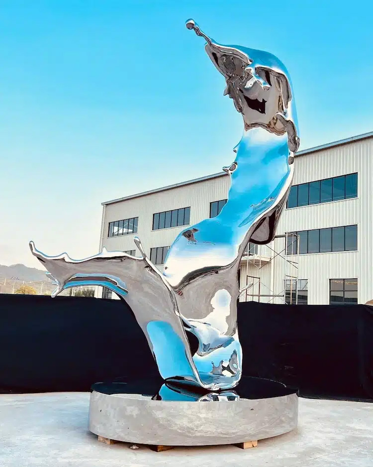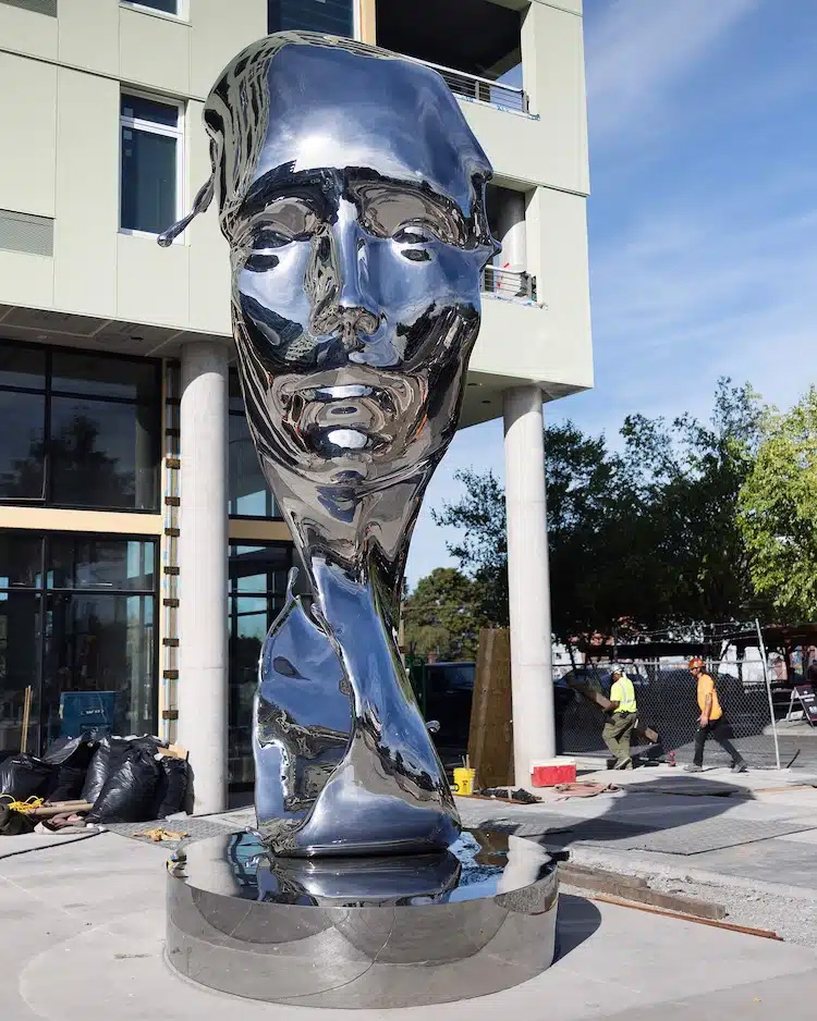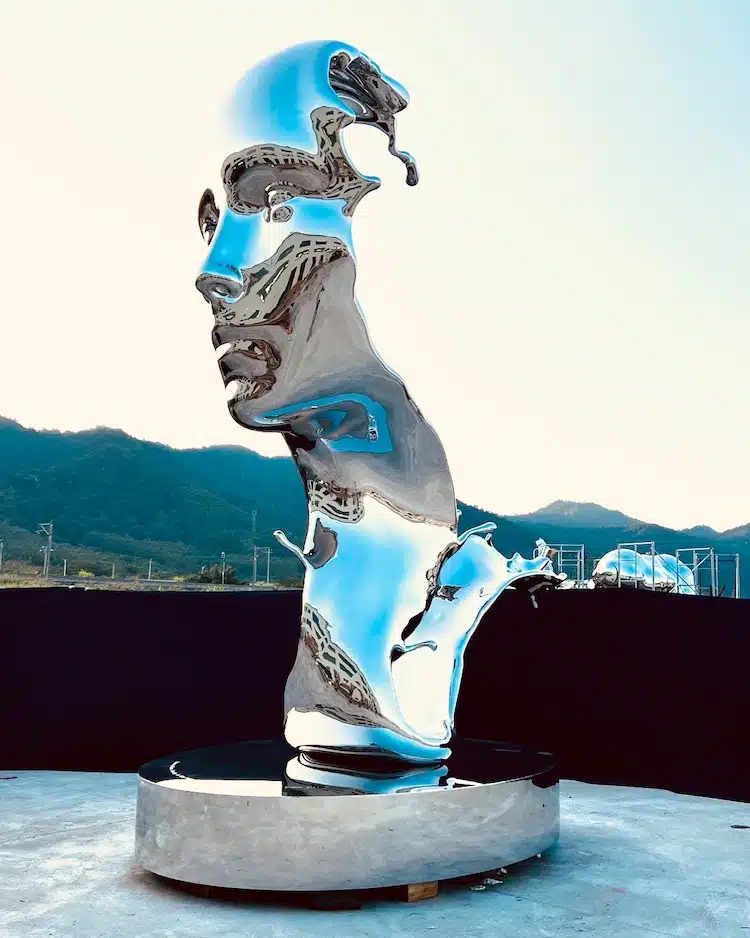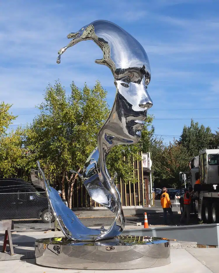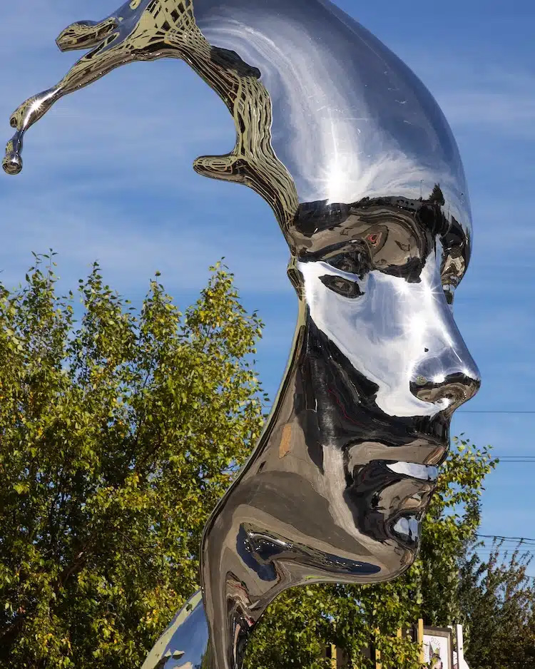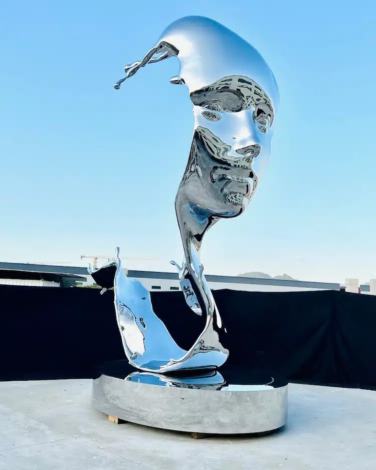 Aptly titled Splash, this 6,000-pound, 20-foot-tall sculpture blends the shape of a human face with the flowing movement of water. Benisty rendered the piece in mirror-polished stainless steel, making it look solid yet fluid, almost as if the metal is melting or dripping like liquid. Viewers can walk all around the sculpture to appreciate its meticulously crafted details from every angle.