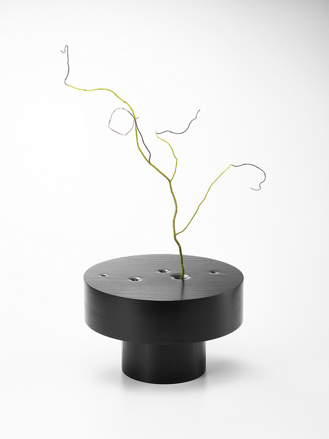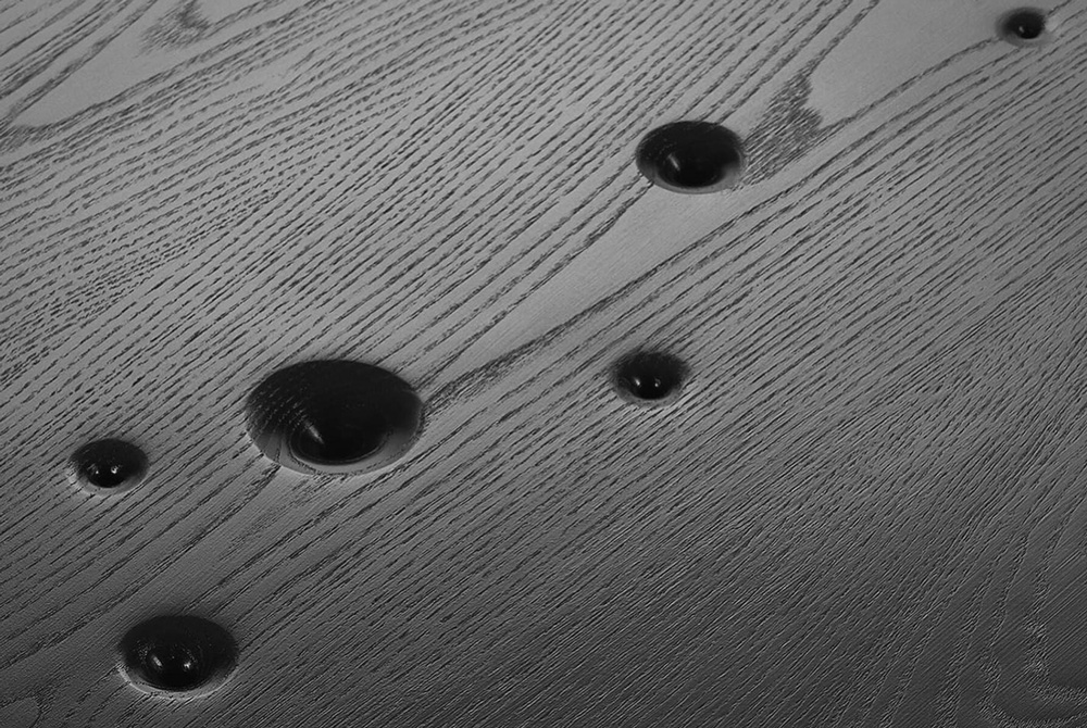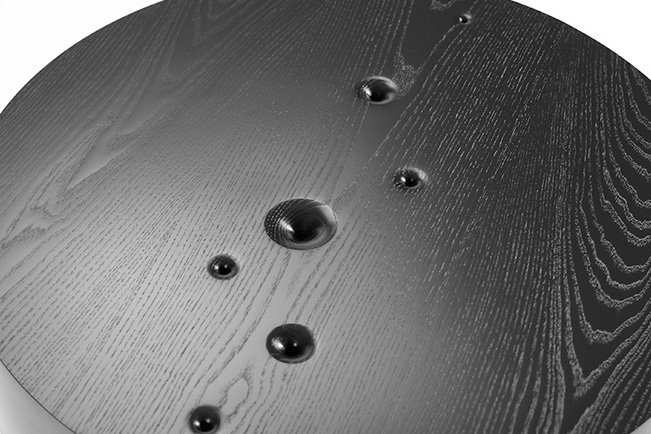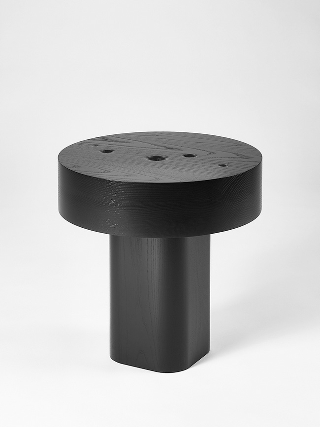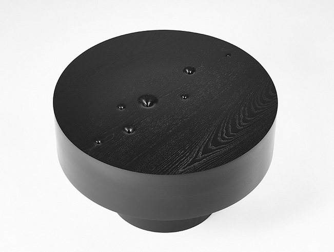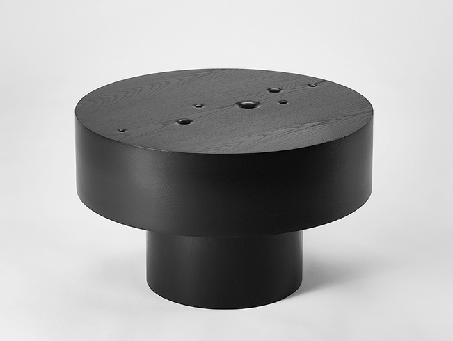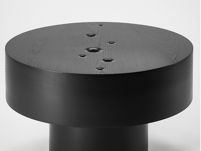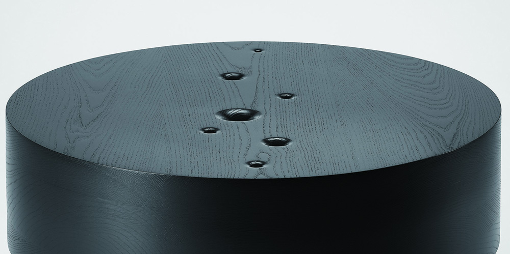 Crafted from blackened wood, the tables are composed of heavy, circular masses that represent the immensity and infinity of the cosmos. The choice of material and form reflects the structure and order of the universe, while subtly alluding to the tension between its permanence and the fleeting nature of life.