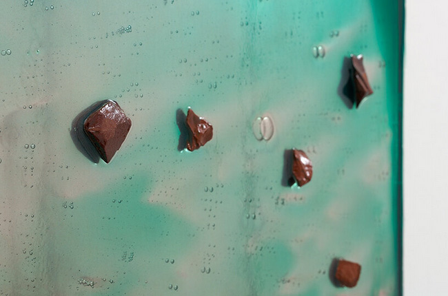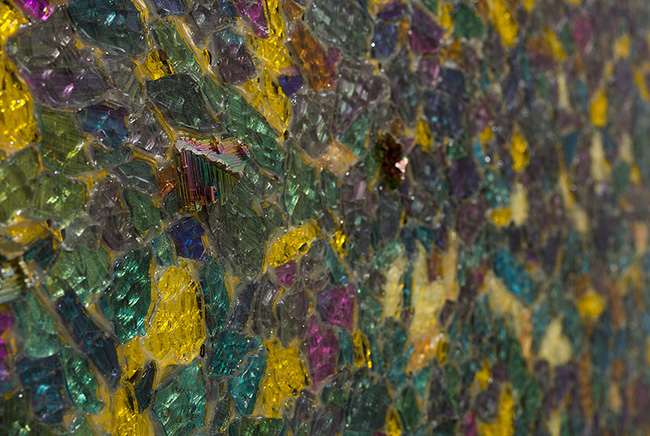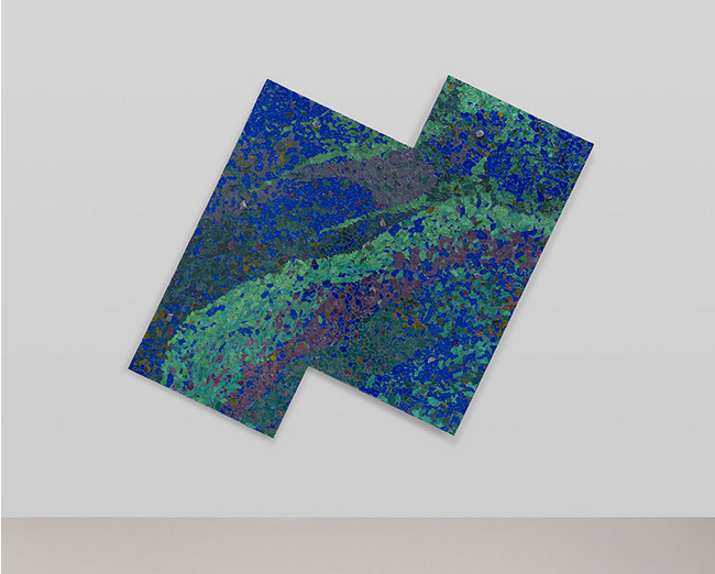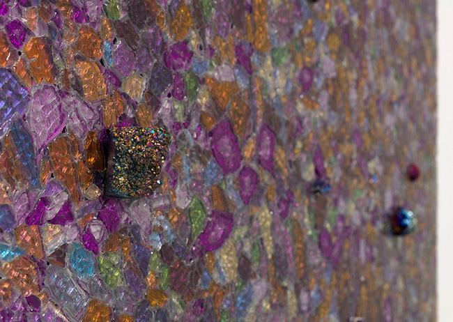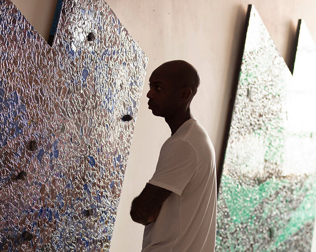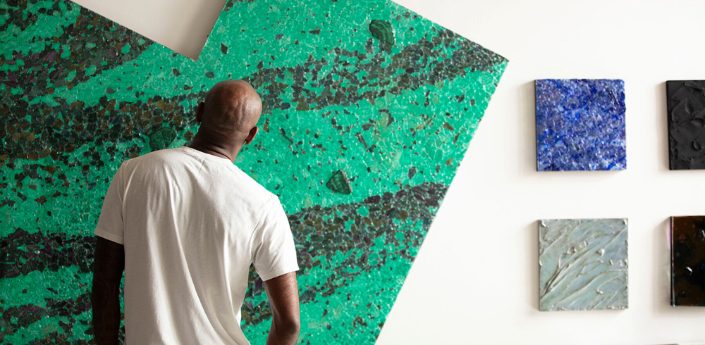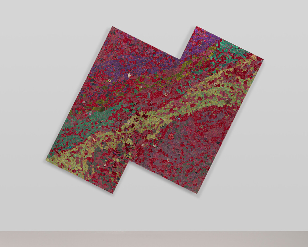 This expanded understanding of color is evident in the tactile richness of Alteronce Gumby’s pieces on view at Prince of the Far Rainbow at Nicola Vassell Gallery in New York. Here, materials like shattered glass, gemstones, and acrylic-colored mirrors become the building blocks of color. His ‘moonwalker’ paintings, which incorporate reflective surfaces, shimmer and shift as viewers move around them, evoking ever-changing landscapes. ‘I wanted to capture that sense of motion and transformation,‘ Gumby says. ‘These paintings are alive in a sense, constantly reacting to their surroundings and to the people who engage with them.’ His use of mirrors, initially inspired by NASA’s cosmic photography, creates an interactive experience where the audience sees both the artwork and themselves, a reflection of the evolving nature of perception.
