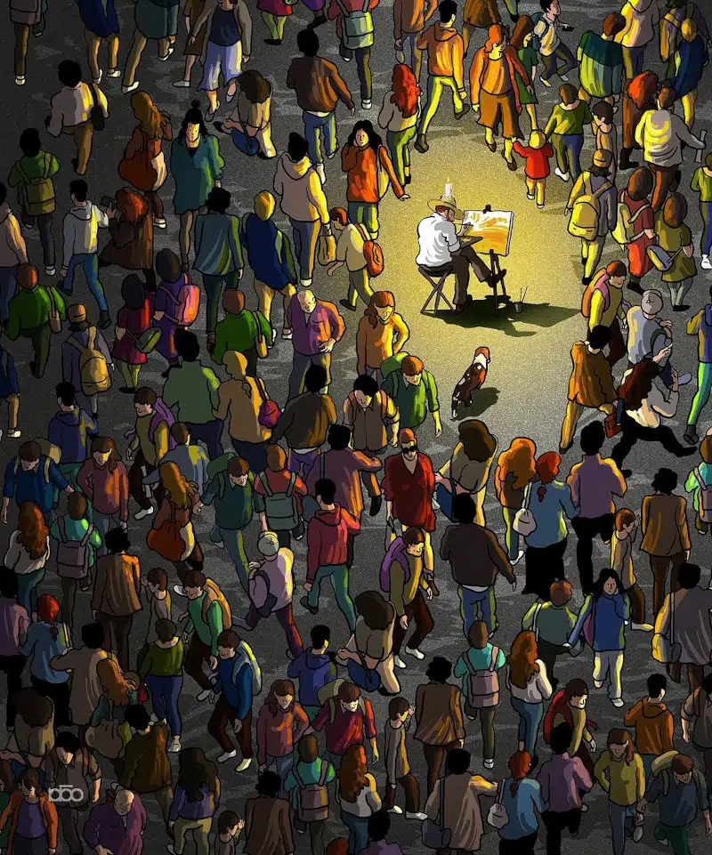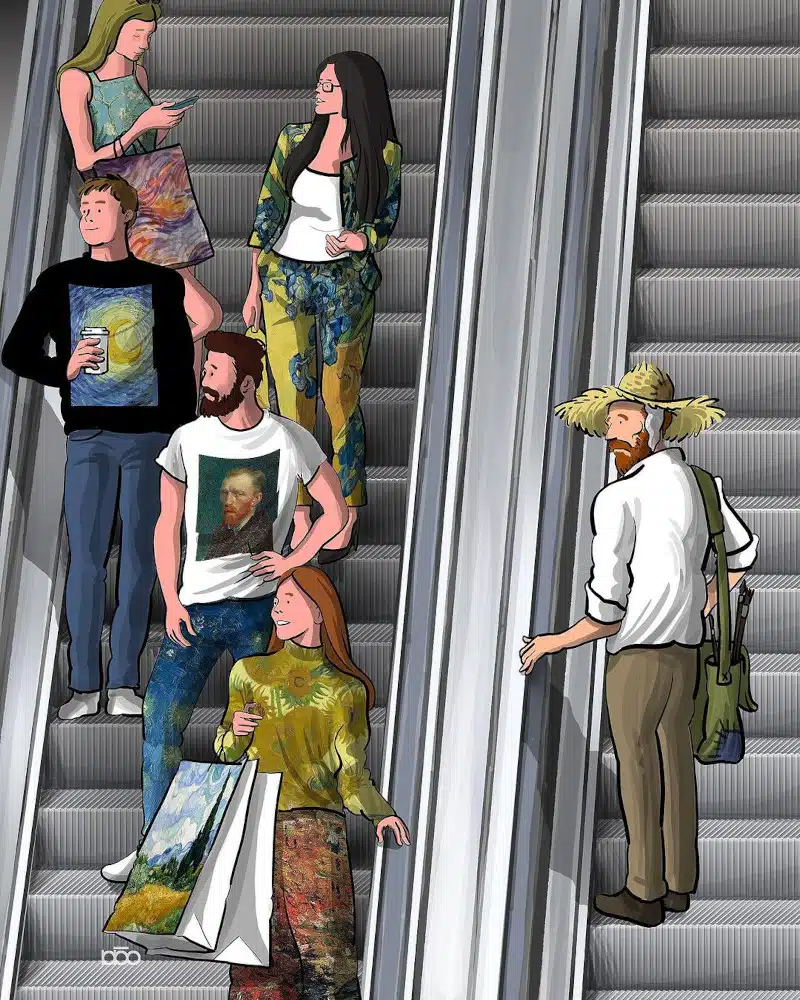 This isn't the first time Moghaddam's Van Gogh has reflected on how the artist would feel in the contemporary art landscape, often depicting him feeling like an outsider or trying to find his place in a fast-paced, tech-focused world. For example, he has imagined Van Gogh coming across people wearing merch with his paintings (which he can't afford) or posing with a mural of his Sunflowers but not realizing the man they've asked to snap the picture is the artist himself.